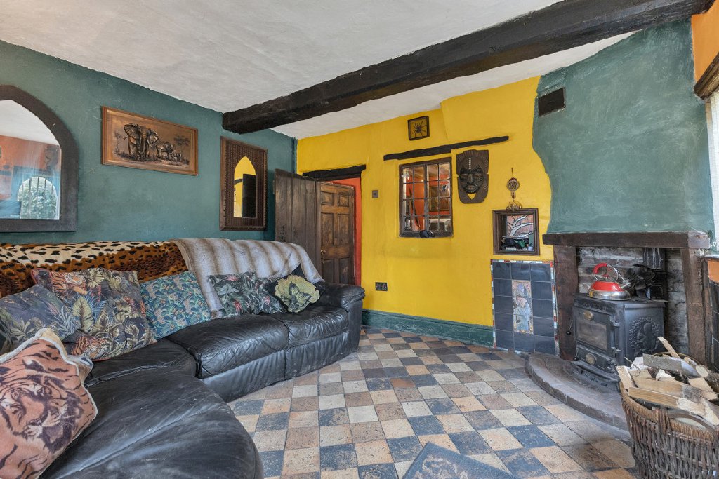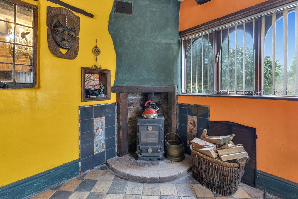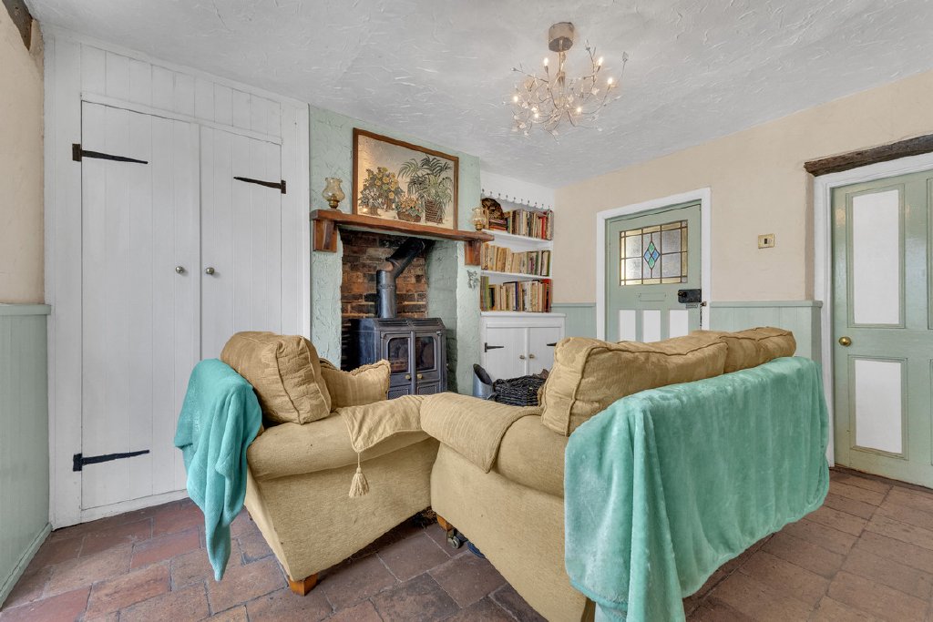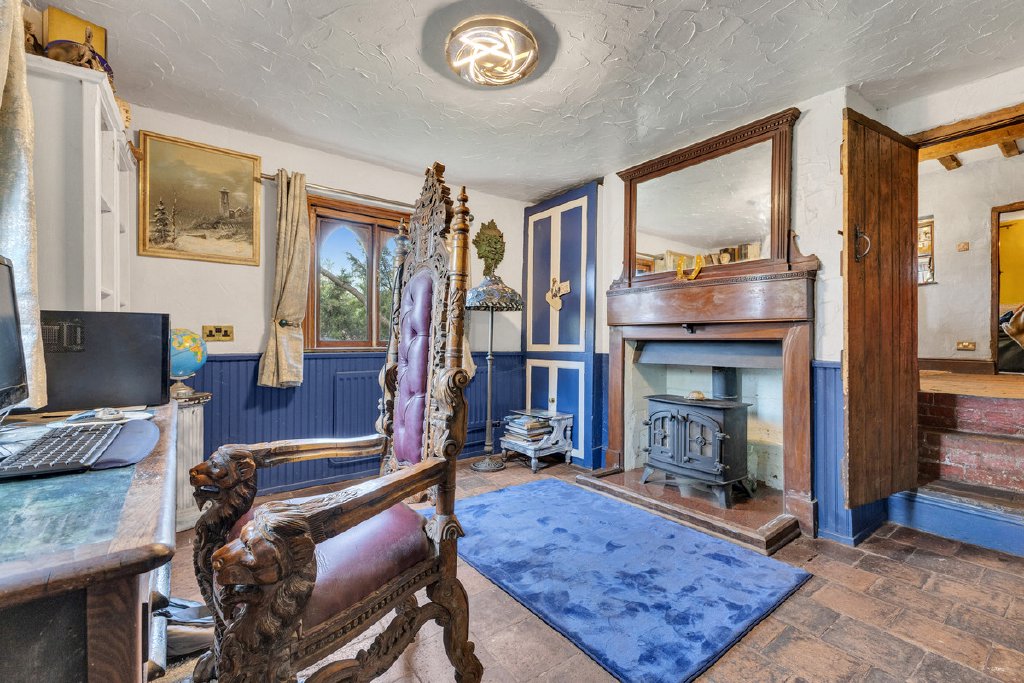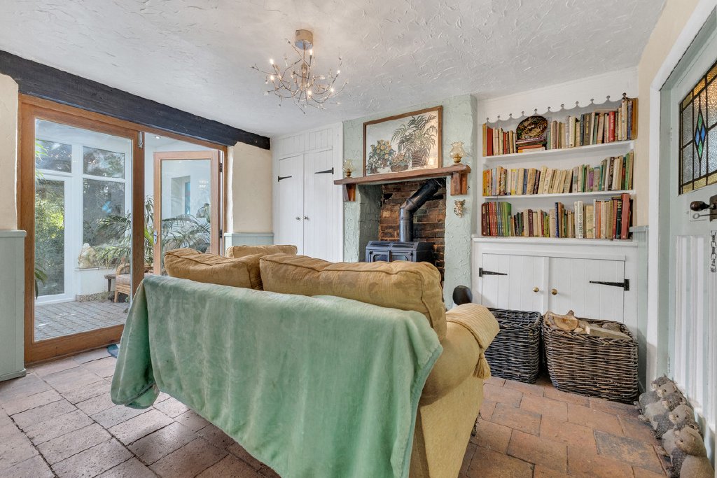 Entering through the front door and stepping beyond the porch, you are welcomed into a charming snug featuring an open fireplace housing an ornate wood burner, immediately creating a warm and inviting atmosphere.