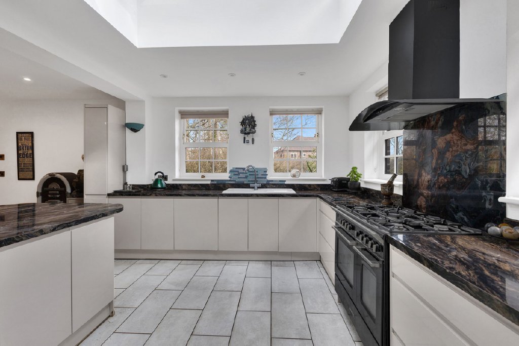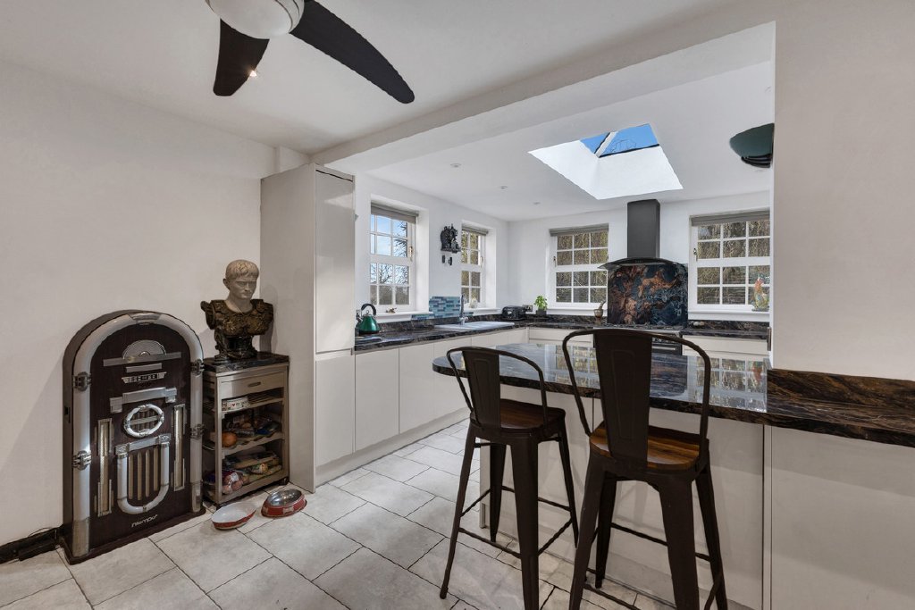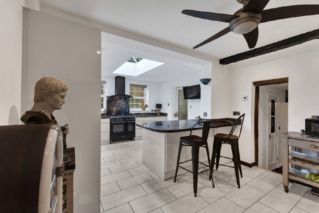 An inner hallway leads to a useful downstairs WC, whilst a short flight of steps rises into the beautifully designed kitchen, which has been recently upgraded and thoughtfully extended to create a spacious and light-filled heart of the home. Well-appointed and carefully arranged, the modern kitchen benefits from underfloor heating and features contemporary cabinetry, quartz-effect worktops and a range-style cooker, while a central island offers generous preparation space and forms a natural focal point for this sociable part of the home.