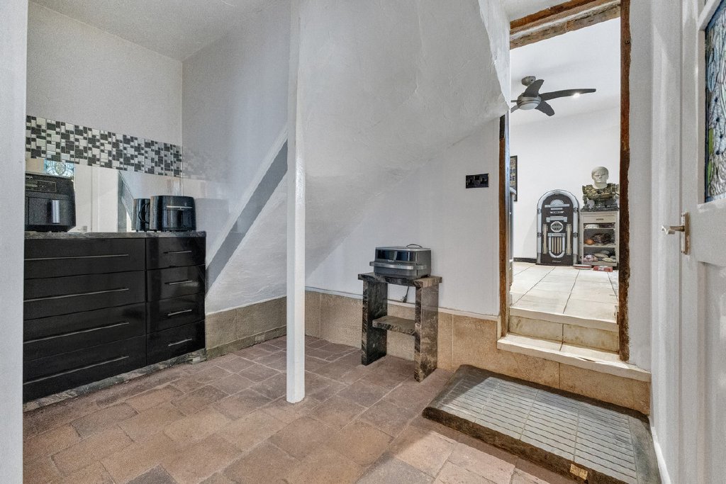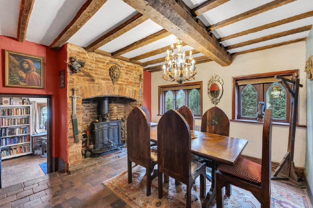 From the kitchen, another doorway leads through to the characterful dining room, a wonderful setting for gatherings and entertaining. Rich in period charm, the room features attractive arched windows, traditional flagged flooring and an impressive fireplace that creates a striking focal point.