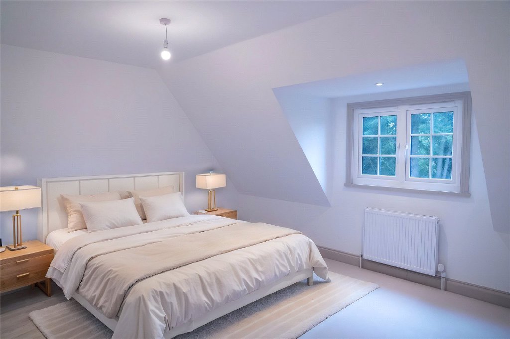 Impressive return staircases with oak balustrades and stairwell pendant lighting lead to the first and second floors, over which there are four generous double bedrooms.