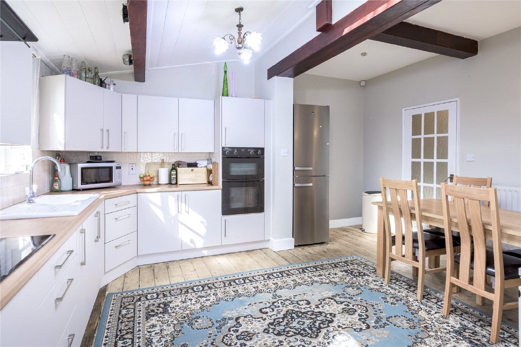 The spacious kitchen/breakfast room, fitted with ample storage and work surfaces, flows into a conservatory overlooking the garden—ideal for morning coffee or relaxed weekends. Additional ground floor living includes a snug or home office with character beams, a feature fireplace, and two double bedrooms with ensuite WCs, alongside a stylish family bathroom.