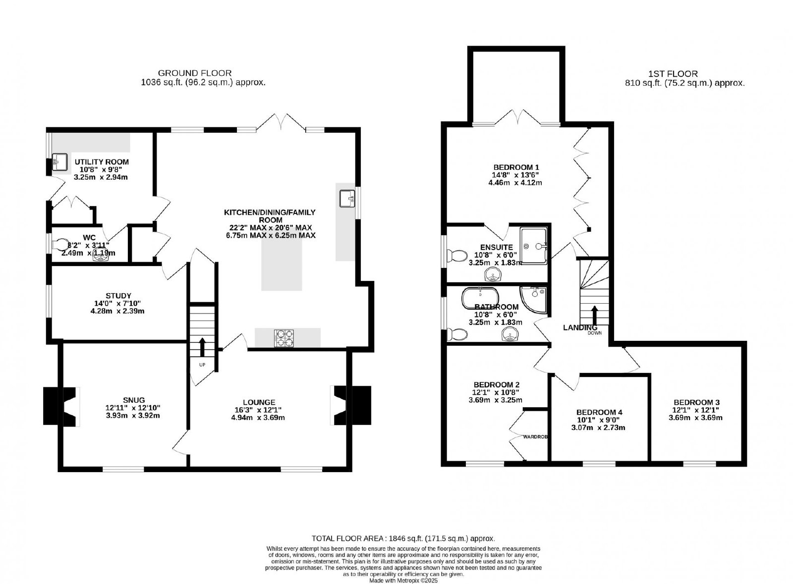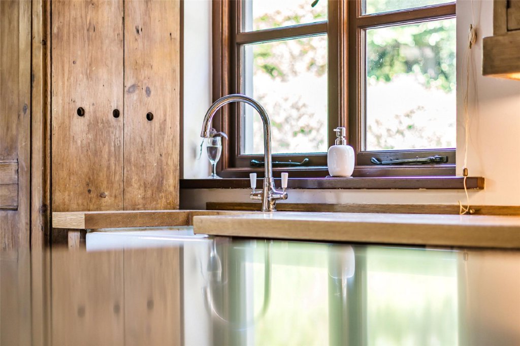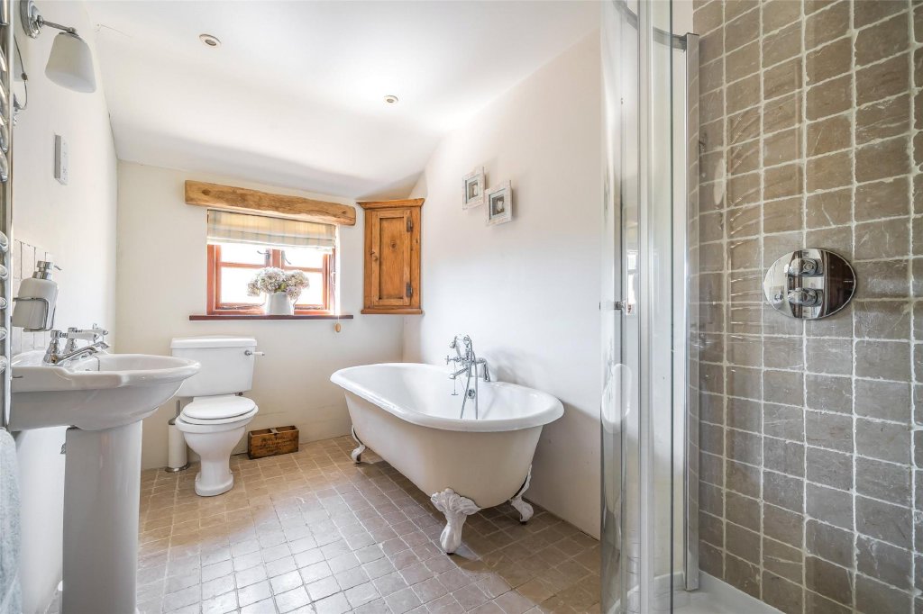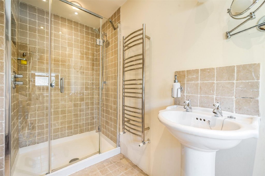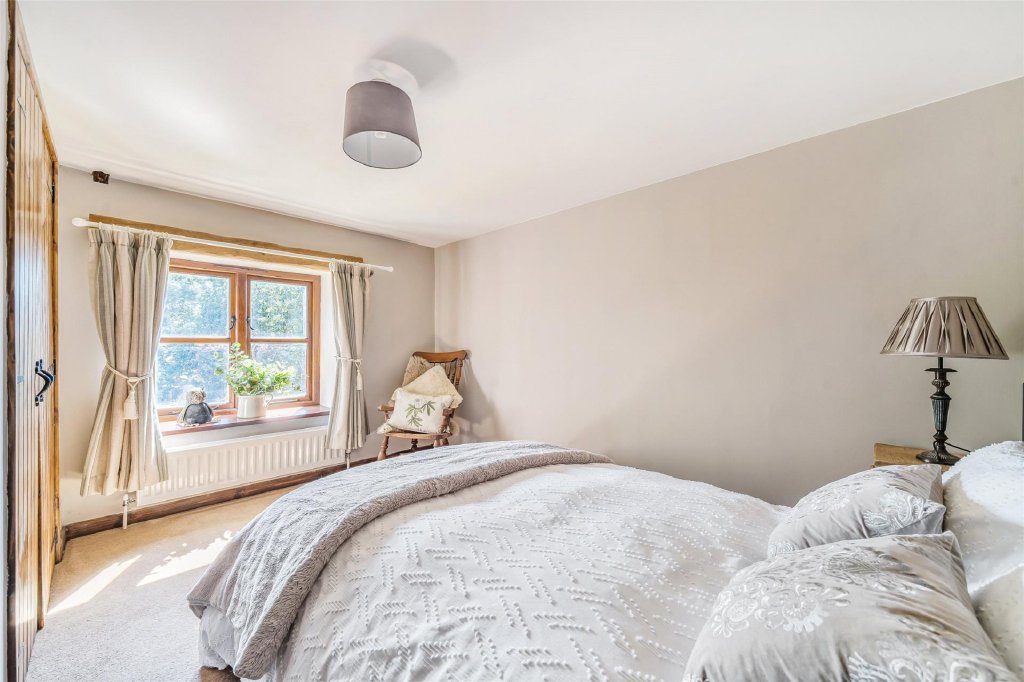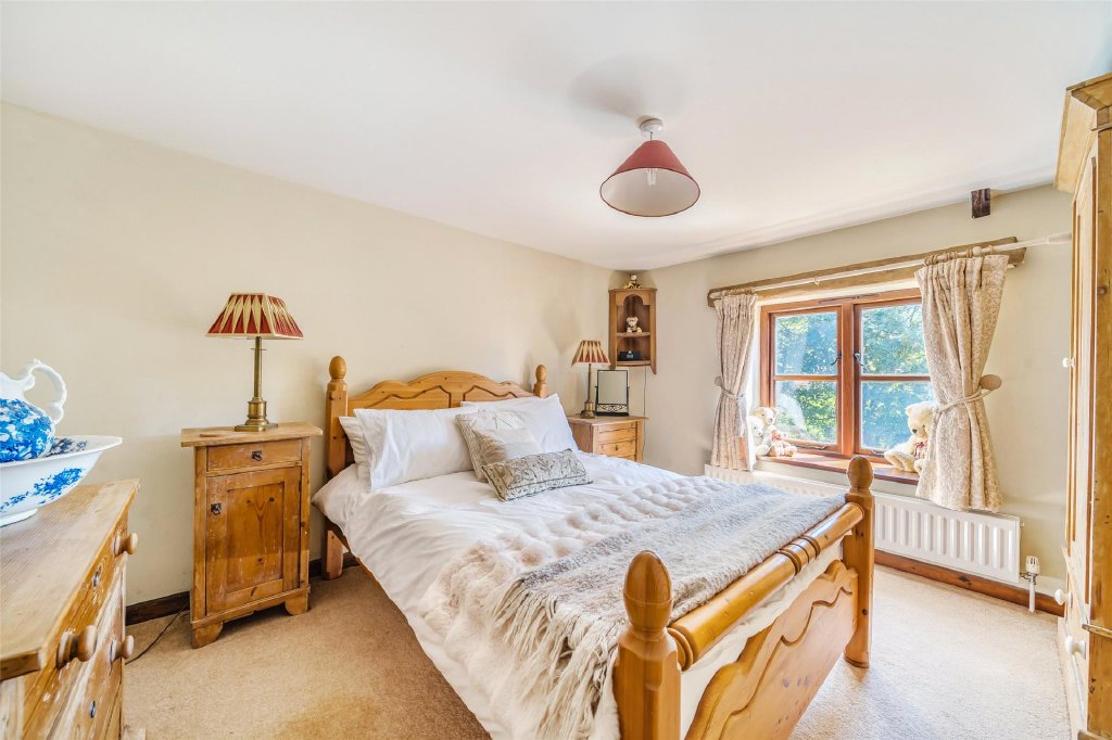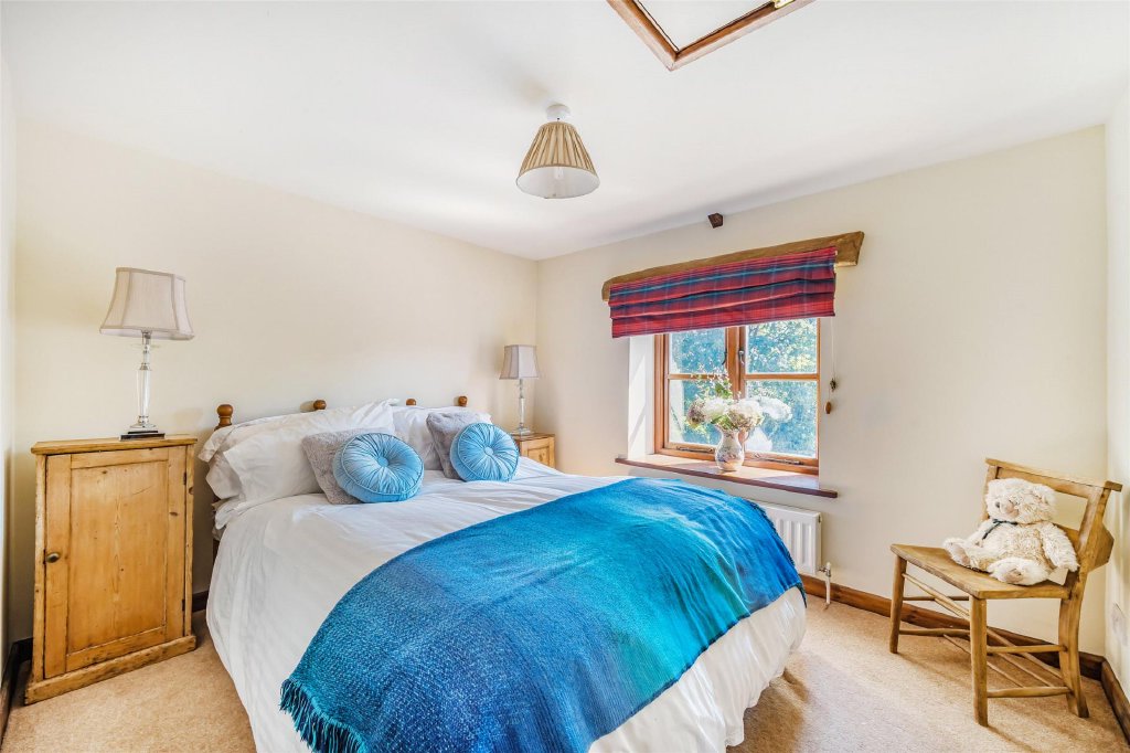 Upstairs, there are four generous double bedrooms. The main suite is particularly impressive, complete with fitted wardrobes, a stylish en-suite shower room, and French doors leading to a private bridge that connects directly to the garden.