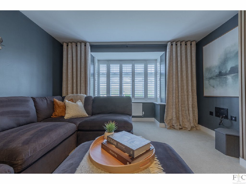 The ground floor welcomes you with a generous entrance hallway and guest cloakroom, leading into a well-proportioned lounge centred around a contemporary media wall with inset electric fire - ideal for relaxing or entertaining. To the rear, a fabulous open-plan dining kitchen forms the heart of the home, flooded with natural light through a walk-in box bay window with French doors opening onto a porcelain tiled rear terrace. The kitchen is fitted with timeless cabinetry, quartz work surfaces, and integrated appliances, featuring a peninsula island with casual seating, complemented by an adjoining utility room with internal access to the double detached garage and an external door to the garden. A versatile study or snug completes the ground-floor accommodation, perfect for working from home or a quiet retreat. Fitted shutters and blinds throughout, along with upgraded power outlets, add a touch of luxury and convenience.