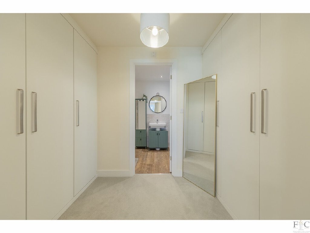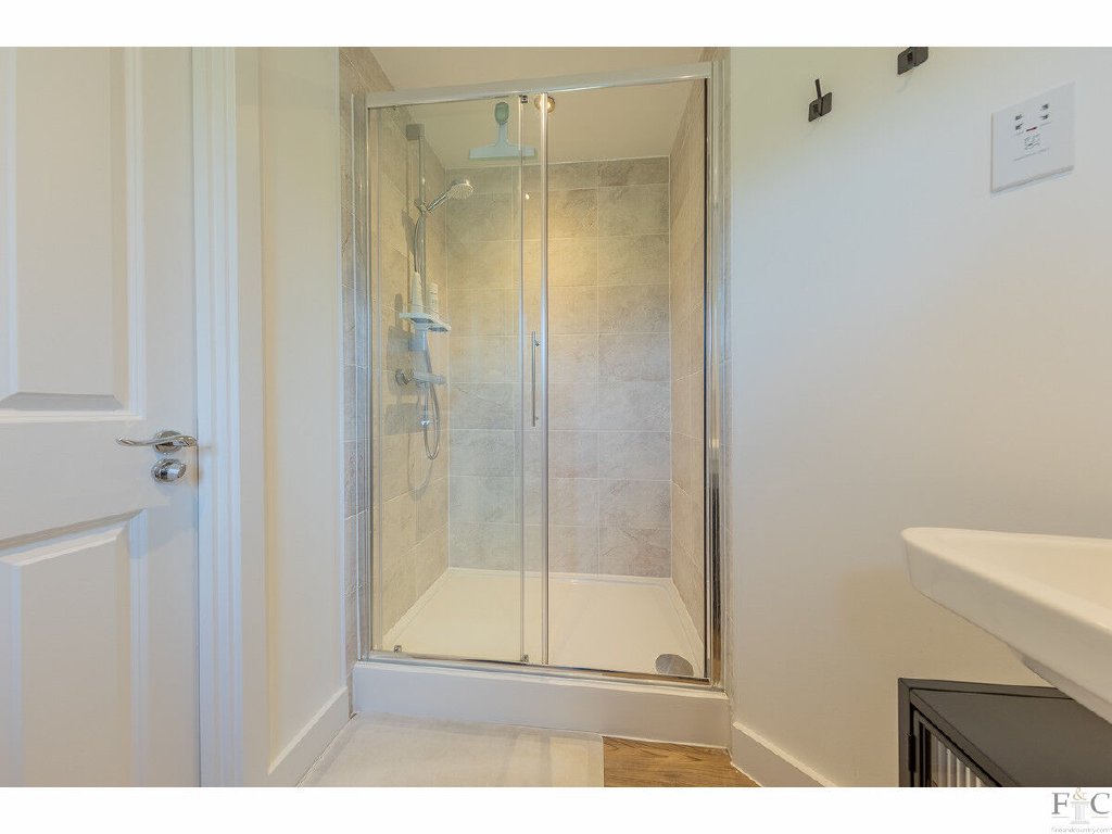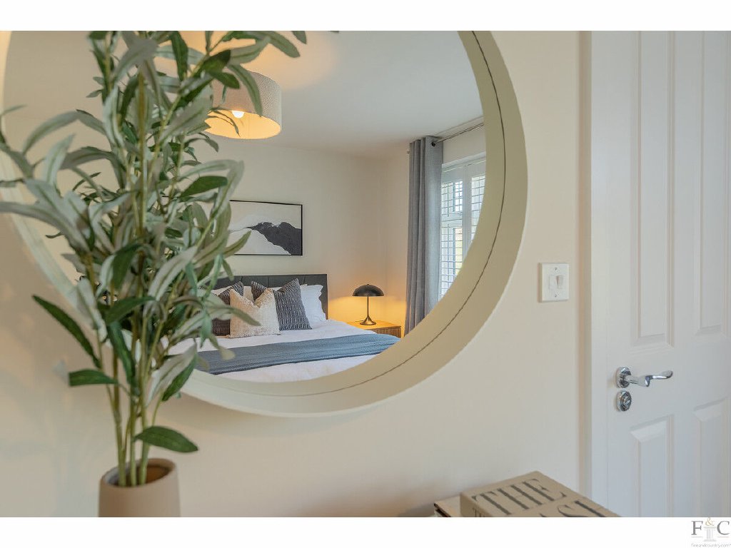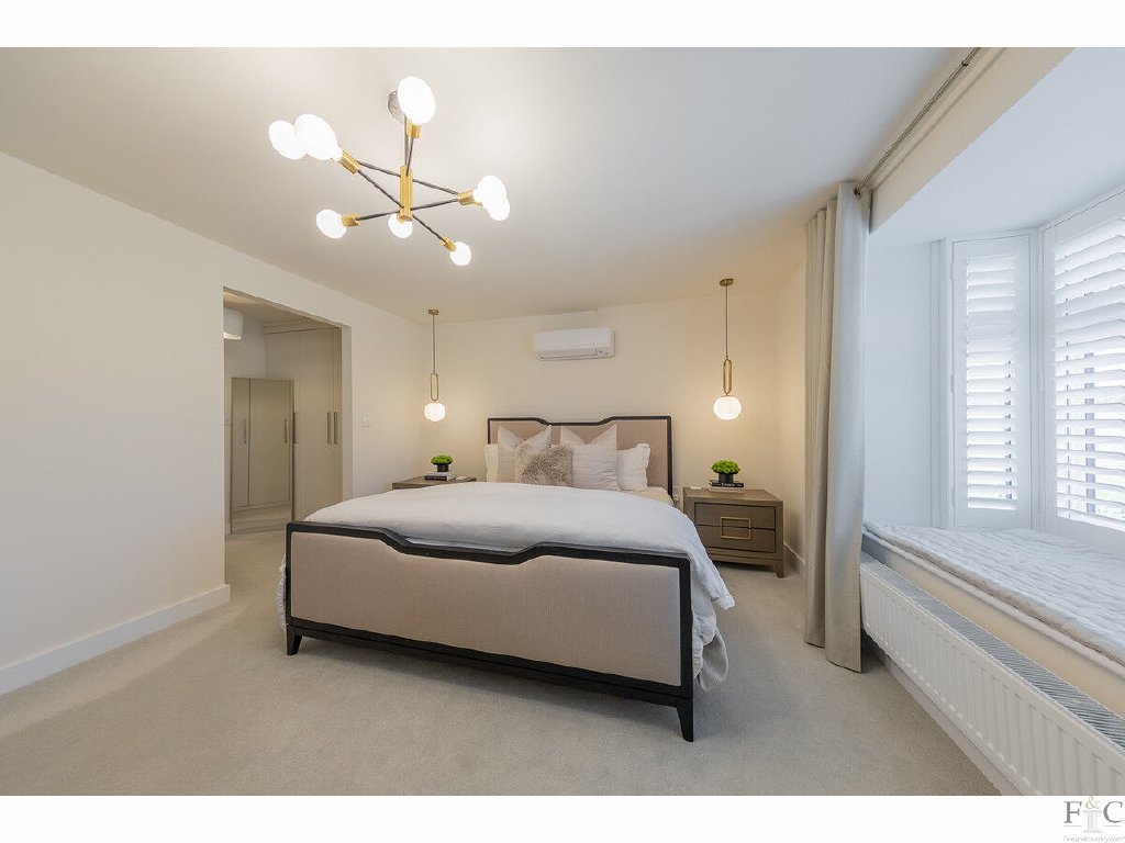Upstairs, a galleried landing leads to a luxurious master bedroom with a window seat, fitted dressing area, ensuite shower room, and air conditioning for year-round comfort. A guest bedroom benefits from fitted robes and its own ensuite, while two further double bedrooms share a stylish four-piece family bathroom - ideal for family living.