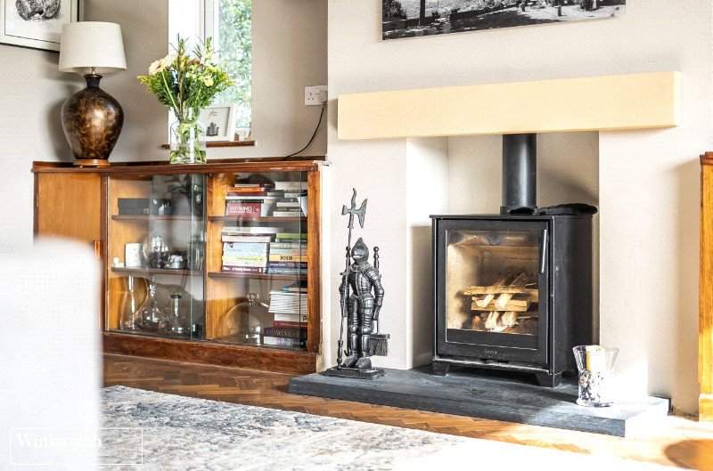 The EXISTING FAMILY HOME has a large central hallway. Off to the right is the living room that has a log burner and a low bay window framing a special view out over the countryside to the front.