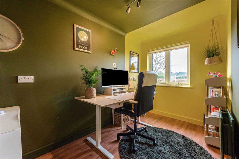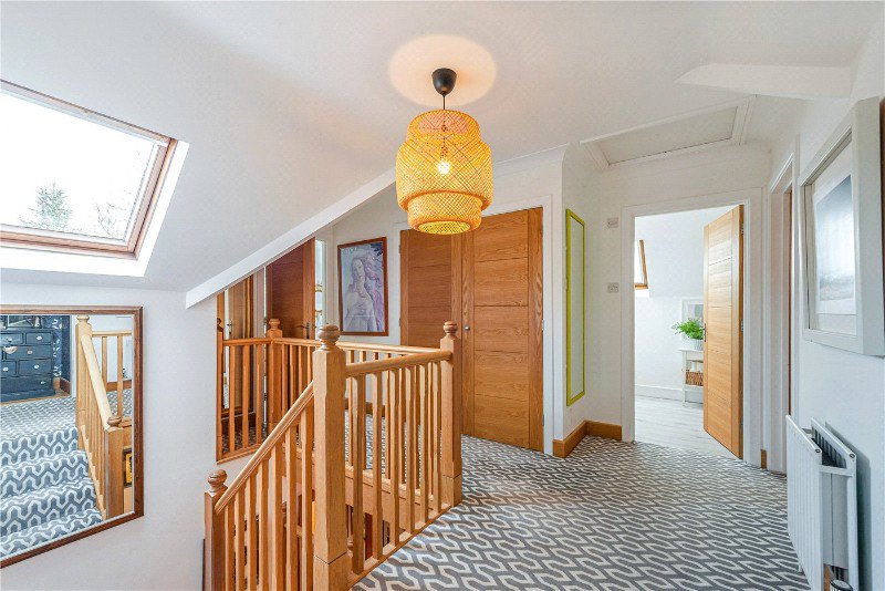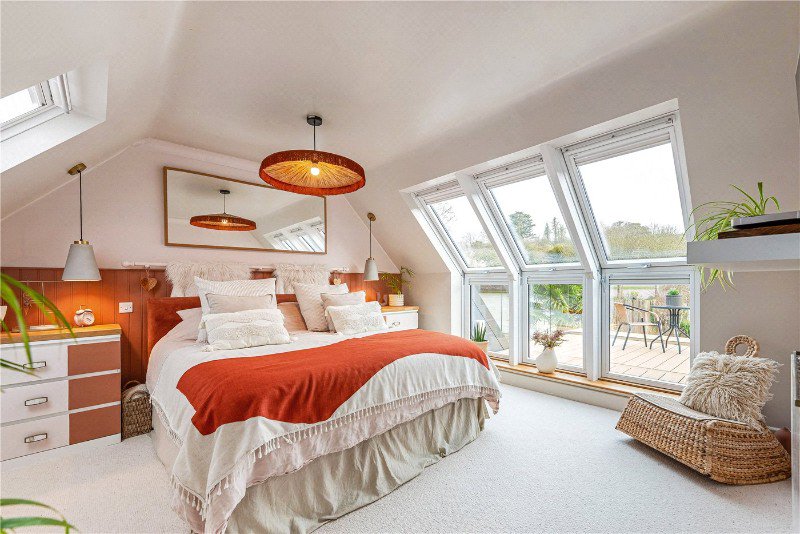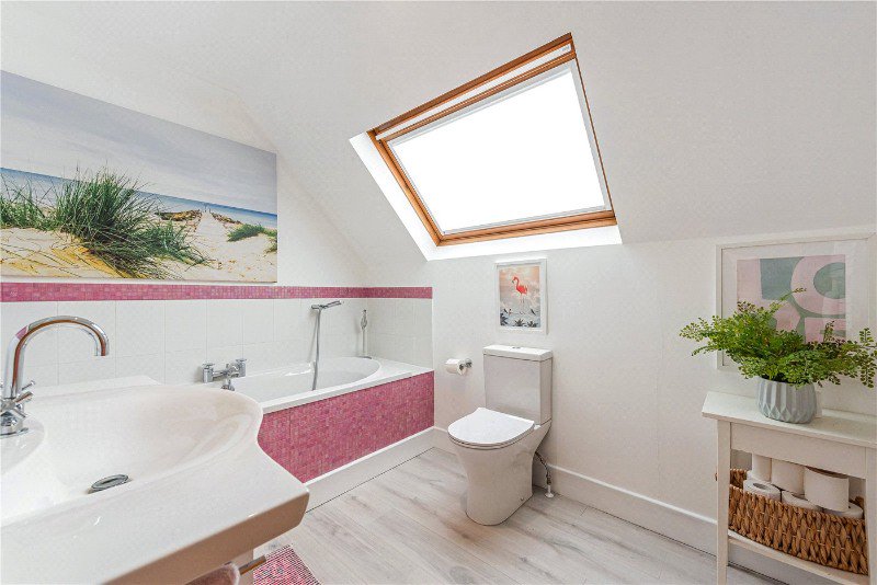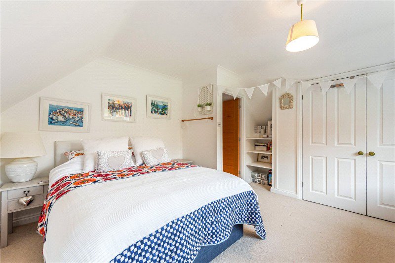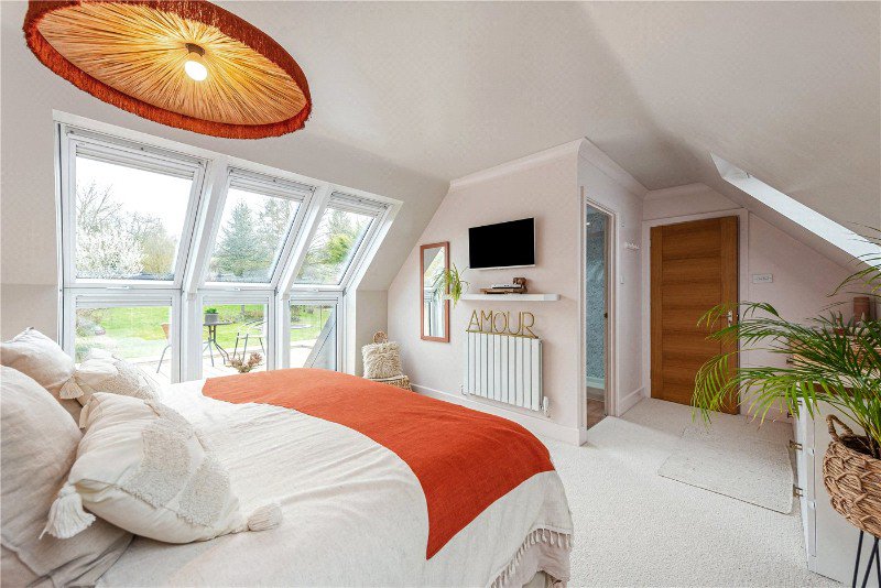 On the first floor, the principal bedroom benefits from eaves storage, a large roof terrace with an incredible outlook, and a private en suite. Two further bedrooms are served by a family bathroom, both offering generous proportions and excellent storage. The layout provides comfort and adaptability for growing families or visiting guests.
