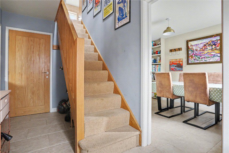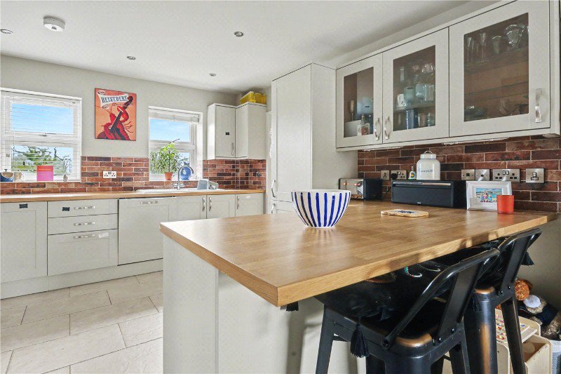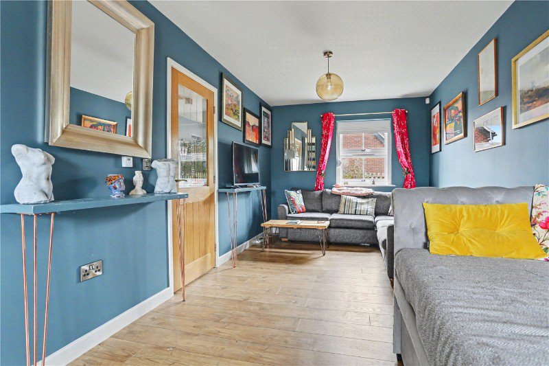 At the heart of the home, the kitchen/dining space provides a true hub, a place equally suited to everyday living and entertaining. With ample workspace, quality fittings and a breakfast bar arrangement, it effortlessly caters to busy mornings and relaxed evenings alike. The dining area comfortably accommodates a full-sized table, creating a sociable setting for hosting, while views back across the garden beautifully connect indoor and outdoor living. The main living room offers a warm yet stylish retreat, flooded with natural light and benefiting from double patio doors that open directly onto the garden, further enhancing the seamless flow throughout the ground floor.