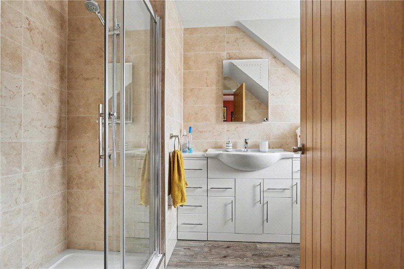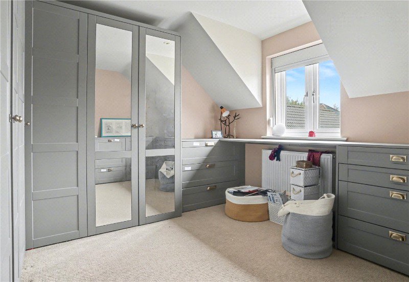 Upstairs, the home continues to impress. Five well-proportioned bedrooms provide comfortable and versatile accommodation, with three enjoying their own en-suite facilities, ideal for modern family life or visiting guests. The rear-facing bedrooms in particular take full advantage of the uninterrupted countryside views, with one of the back bedrooms offering a particularly peaceful outlook across the garden and beyond. Throughout the home, high-quality fitted shutters provide not only a sleek and practical finish but also enhance privacy, security and restful sleep, a feature the current owners have found invaluable.