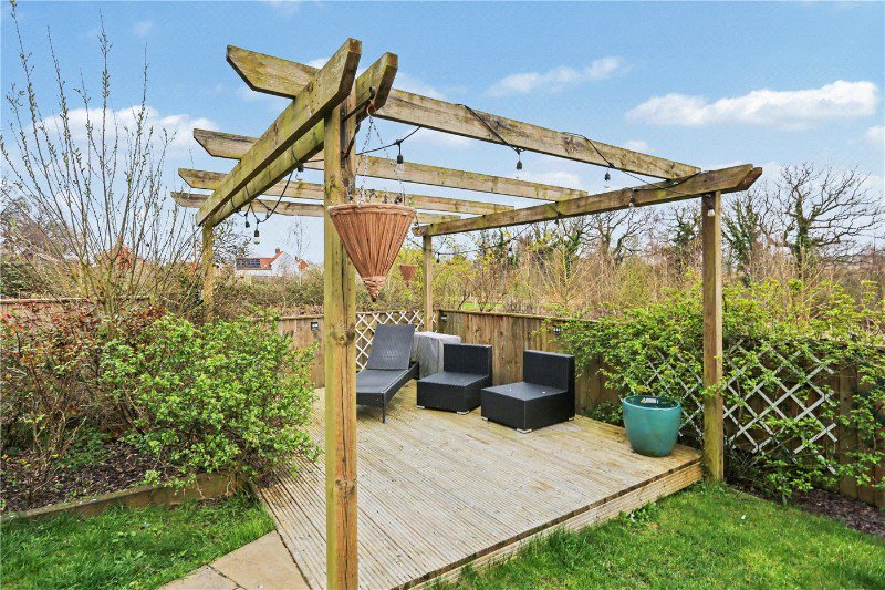 - Landscaped rear garden featuring a raised decking area with pergola perfect for outdoor dining and relaxing