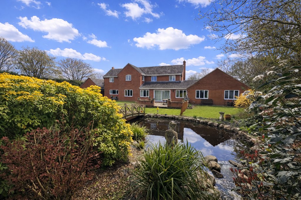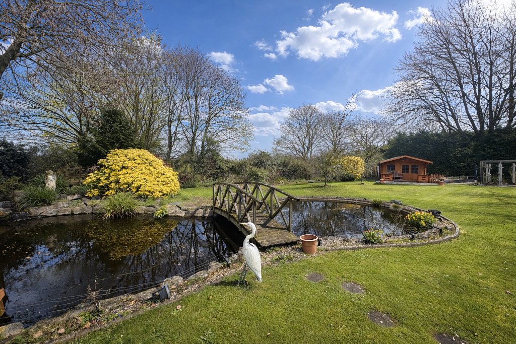 Externally, the property is equally impressive, occupying beautifully maintained grounds of approximately half an acre. The approach is via a sweeping gravel driveway, offering extensive parking and turning space, and leading to a substantial double garage, ideal for both storage and secure parking. The gardens are a particular feature of the property, enjoying a high degree of privacy and thoughtfully landscaped to create a tranquil and picturesque setting. Expansive lawns are complemented by mature hedging and well-stocked borders, while a variety of terraces provide perfect spaces for outdoor dining and relaxation. A striking ornamental pond with waterfall and bridge forms an attractive focal point, enhancing the overall charm of the grounds. In addition, a delightful summerhouse offers a peaceful retreat, ideal for enjoying the surroundings, while further features such as the vegetable garden and outbuildings add to the practicality and lifestyle appeal of this exceptional home.