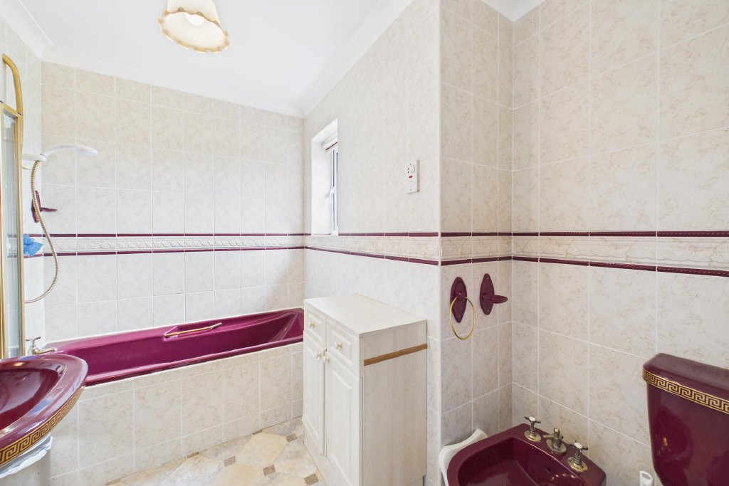 FAMILY BATHROOM Fully tiled and fitted with a burgundy suite comprising a panelled bath with separate shower and screen; pedestal wash hand basin; low-level W.C; bidet; and heated towel rail.