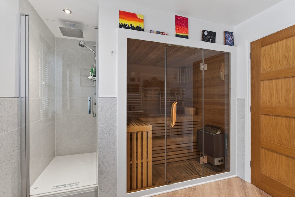 To the rear of the kitchen is a further large family room with a stone fireplace and inset wood burner, a separate room that could be a bedroom with doors leading to the garden but is used as a gym and a luxurious en-suite shower room with a sauna. This whole area could be used as a guest annex if needed.