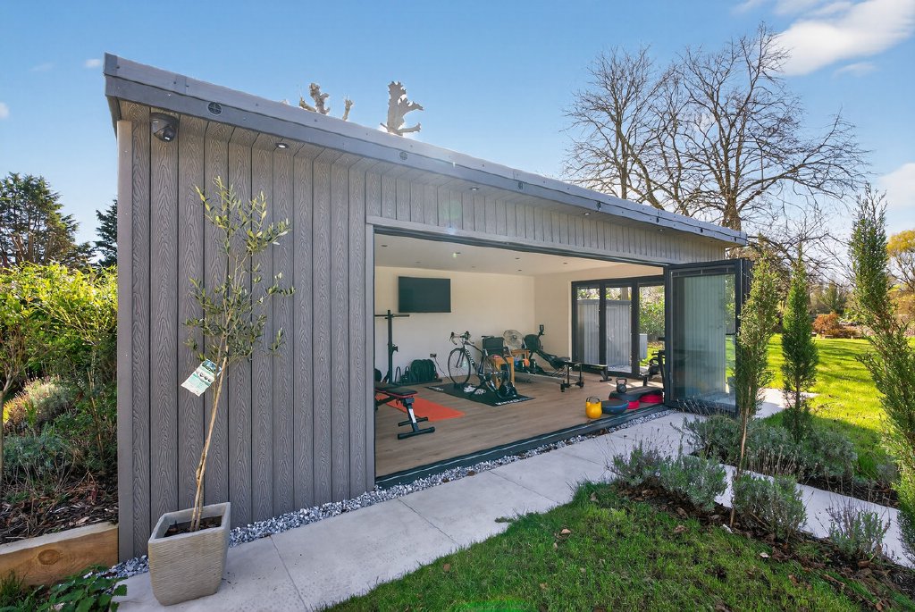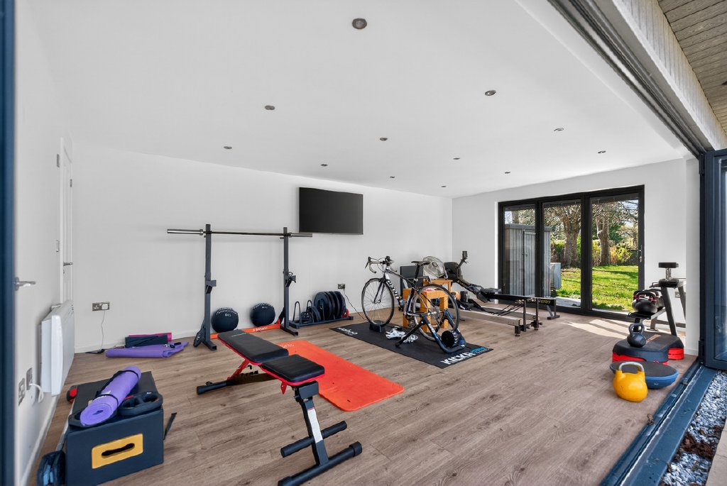 A heated swimming pool creates a resort-style atmosphere, complemented by a stylish garden room complete with shower and WC—ideal for entertaining or accommodating guests.