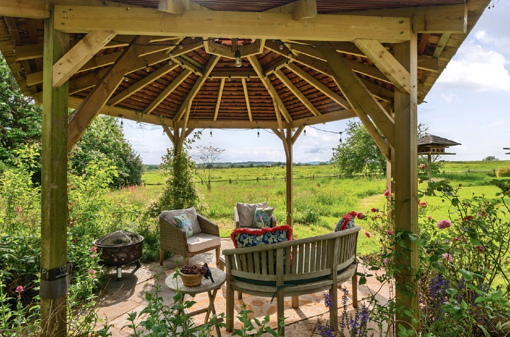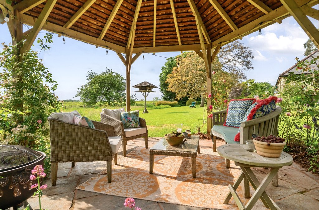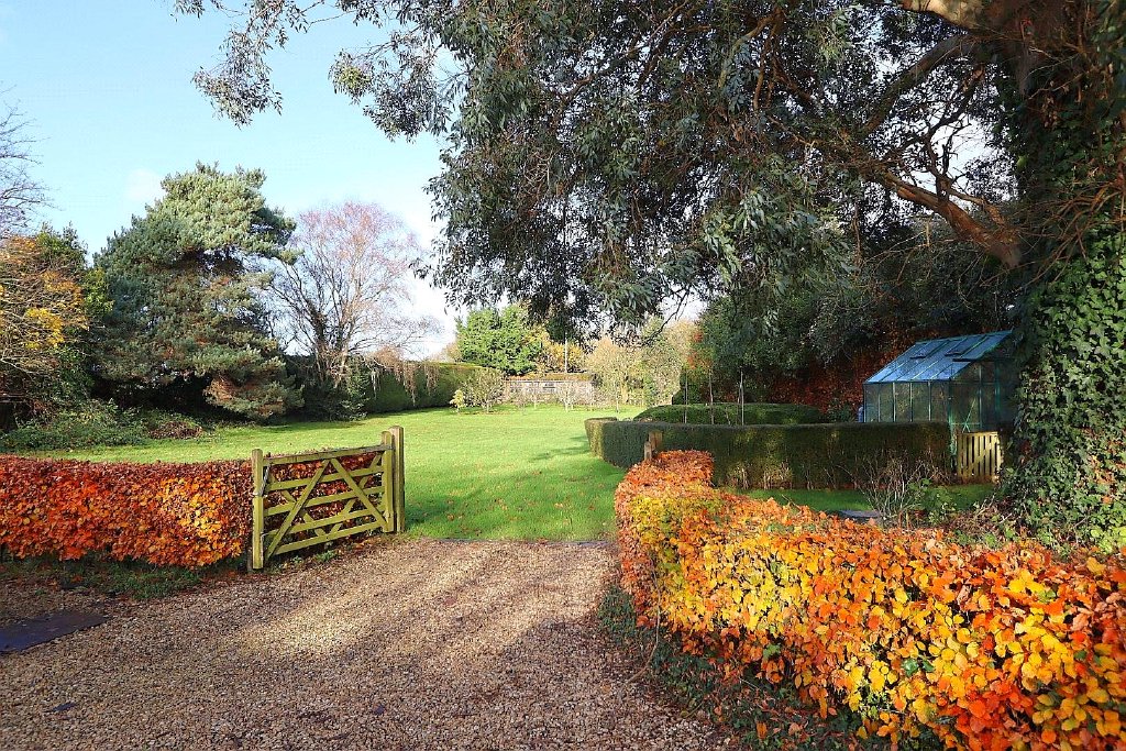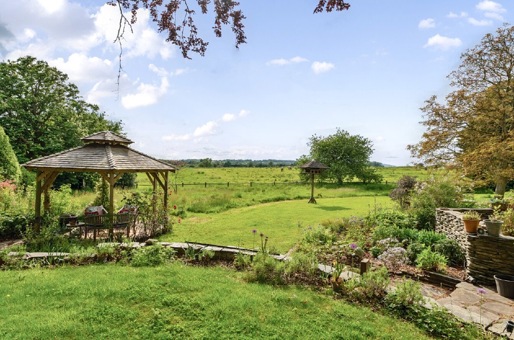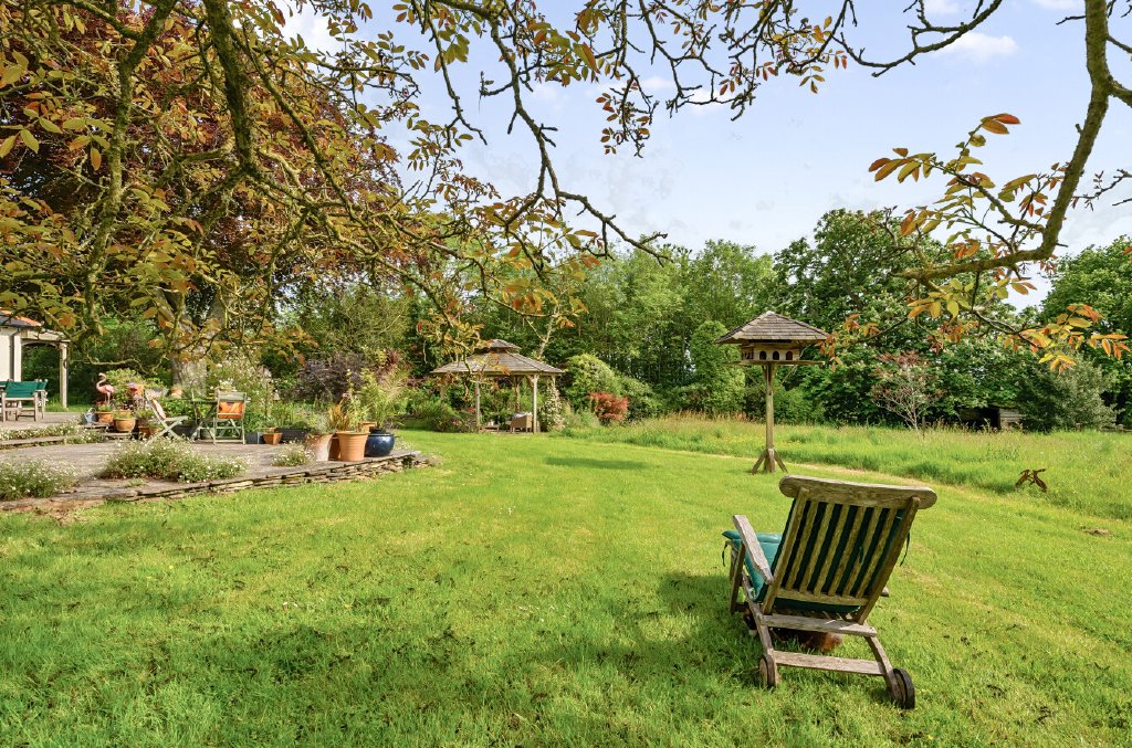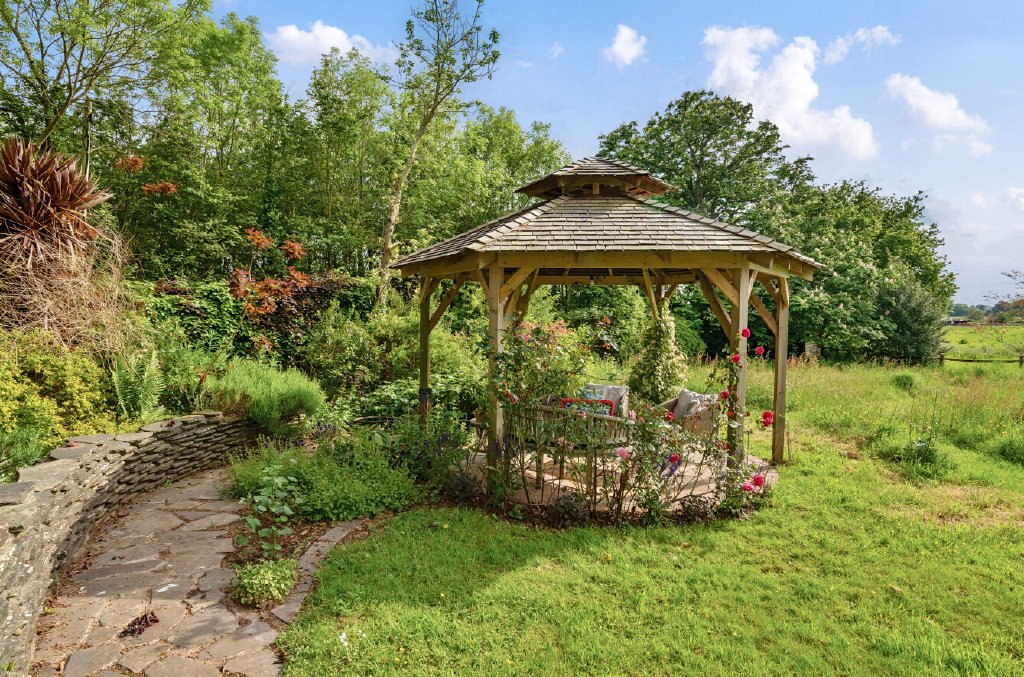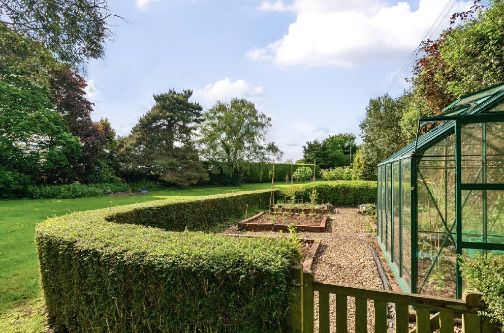A large patio with a veranda and gazebo on a lower garden level take advantage of the afternoon and evening sun, with an area set aside for wildflowers and views across the adjoining fields. A five-bar gate opens onto the rear garden, formerly a lawn tennis court, (which could easily be reinstated) beside an enclosed vegetable area with a greenhouse and one of the sheds/workshops equipped with power and lighting. At the far end of the garden is an orchard with apple, plum, pear, fig, and apricot trees. Beyond this is the second large shed, which could be repurposed for a variety of uses.