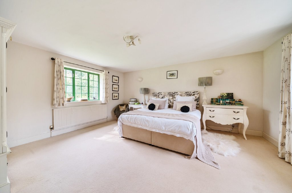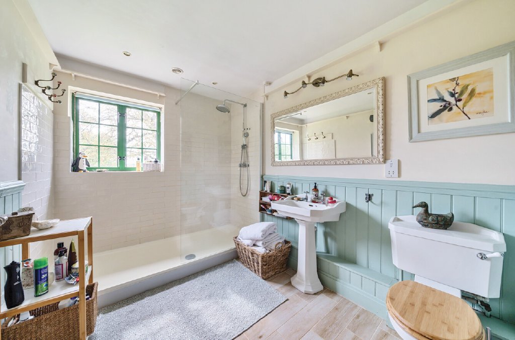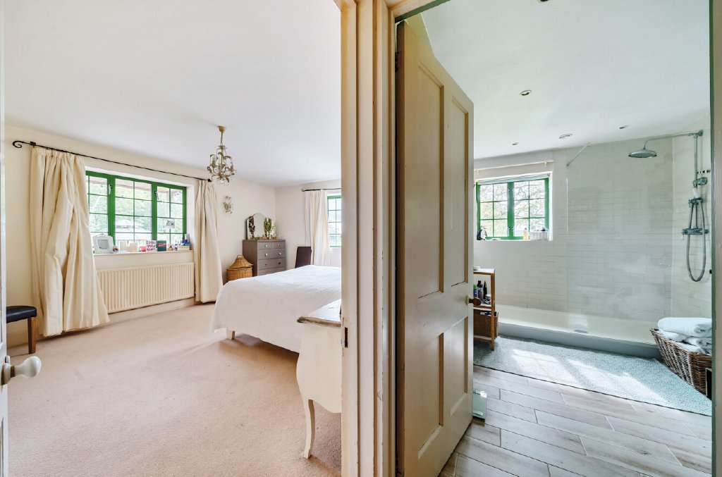 In addition, on the ground floor are the two large principle bedrooms each with two windows overlooking the gardens. Between them is the large shower room with walk in shower enclosure