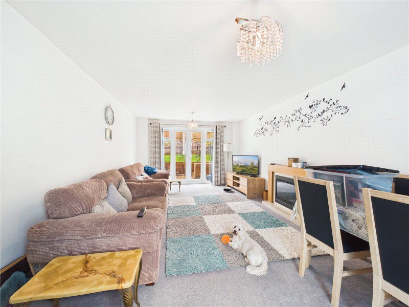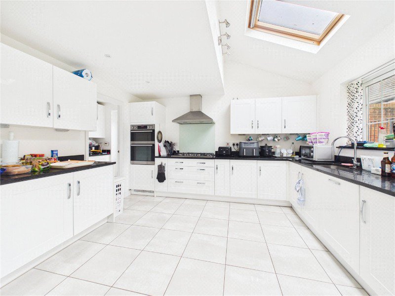 The kitchen/breakfast room forms the heart of the home and is fitted with an extensive range of matching wall, base and drawer units with work surfaces over and an inset sink. Integrated appliances include an eye-level oven and grill, gas hob with extractor hood, and dishwasher. French doors open directly onto the rear garden. A door leads through to the utility room, which offers additional storage, work surface space, a sink, and plumbing for a washing machine, along with access to the outside.
