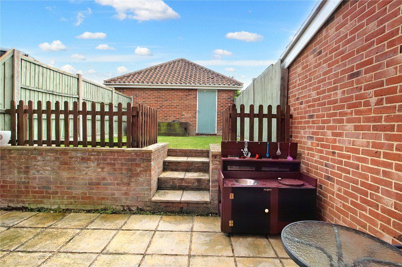 The rear garden enjoys a south-westerly aspect, making it a real sun trap throughout the day and into the evening. Designed with both ease of maintenance and enjoyment in mind, it features a paved terrace ideal for outdoor dining, with steps leading up to a lawned area. The overall layout creates a private and enclosed space, perfect for both relaxing and entertaining.
