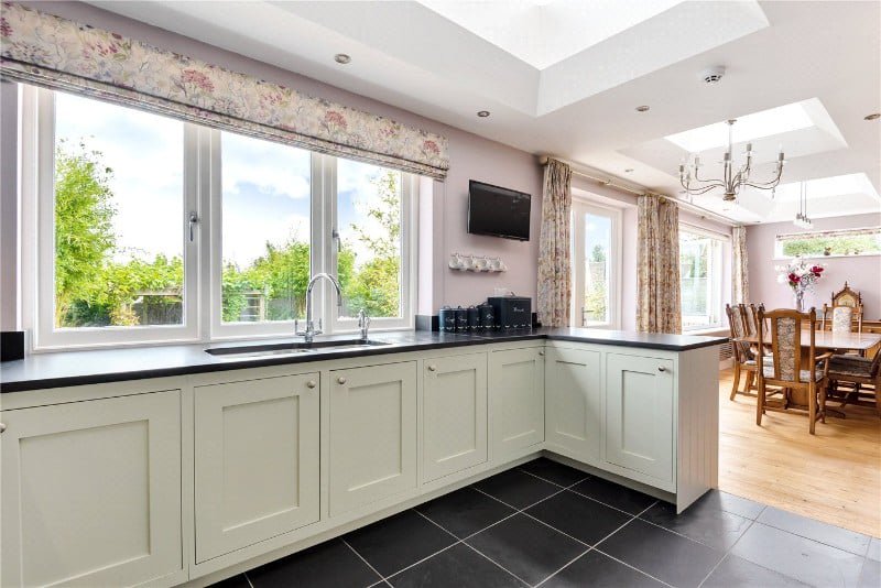At the rear of the house, is the most amazing open plan kitchen, dining, family space extending to 30' x 21' with French doors to the garden and roof lanterns allowing light to pour in.