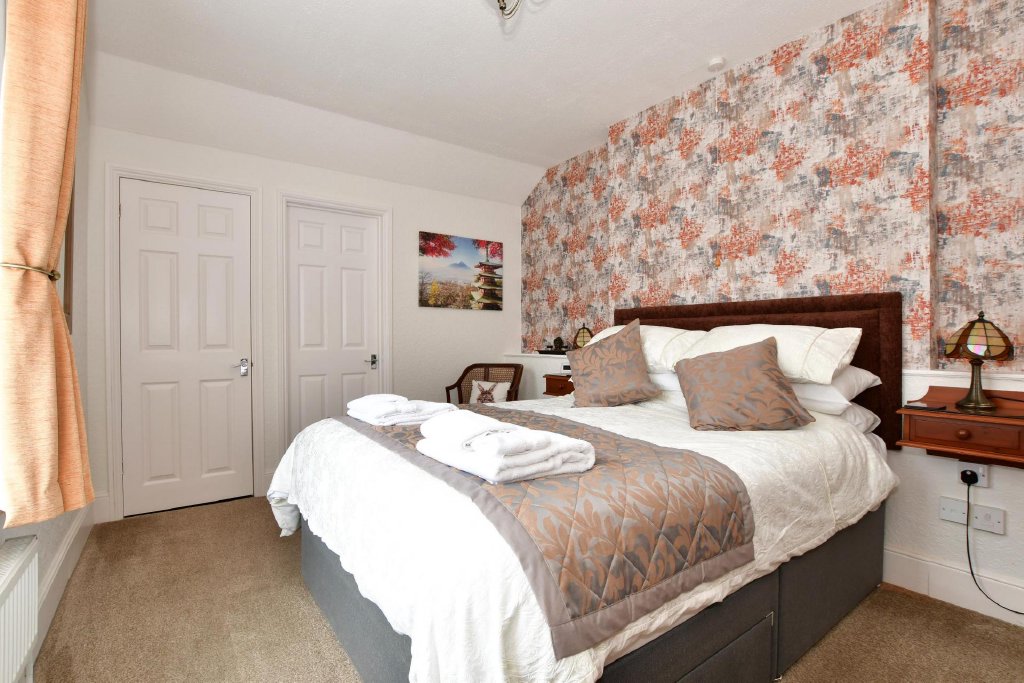 The guest house is set back from the road with a raised front lawn, shrub borders and a low wall flanking the drive that leads to the garage and the front porch with its charming wrought iron feature. The front door opens into the welcoming hall and the first room you come to is the bright and spacious guest dining room with a veritable wall of windows providing plenty of natural light. Next door is the warm and friendly lounge with a delightful cast iron fireplace and white mantlepiece as a focal point as well as open access to the charming sunroom that has French doors to the front garden. Also on the ground floor are two double guest rooms with fitted cupboards and en suite showers that are particularly ideal for guests who find the stairs difficult.