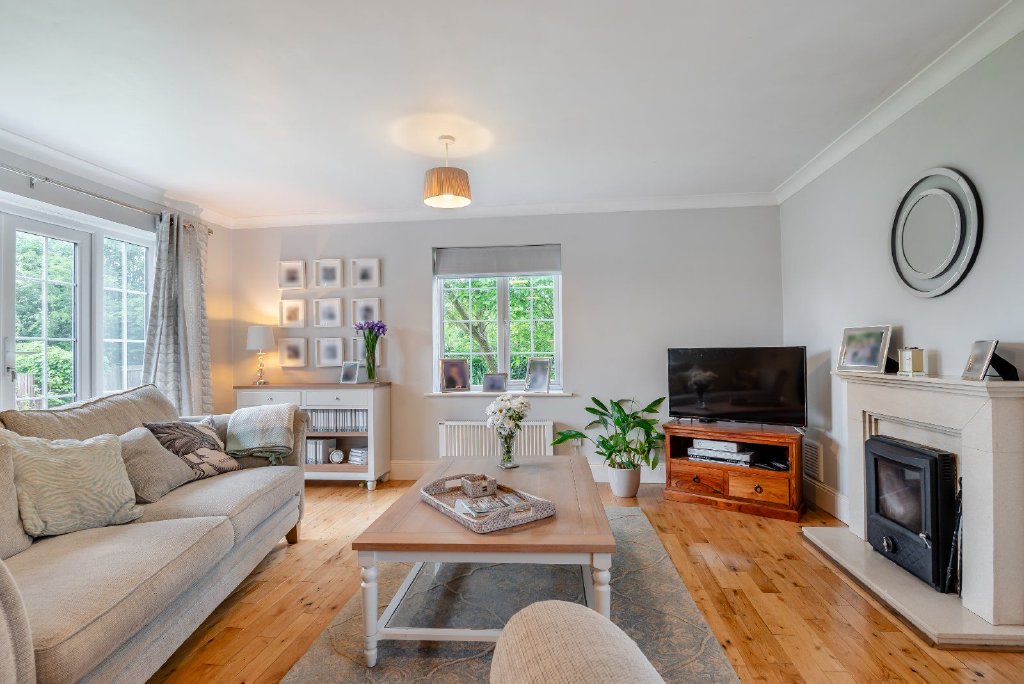 To the side of the property is a private double parking space located directly in front of the garage. The generous wraparound garden is laid mainly to level lawn bordered by mature shrubs and specimen trees and features a pond, raised vegetable beds and paved terraces and seating areas, the whole ideal for entertaining and al fresco dining.