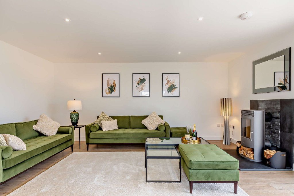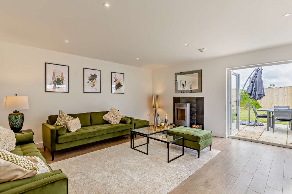 The layout allows flexible open plan living centred by an impressive open plan kitchen dining and informal living area with double doors to the garden. The large sitting room features an contemporary multi-fuel burning stove and signature box bay window. Sumptuous appliances include Bosch integrated units and contemporary sanitary-ware