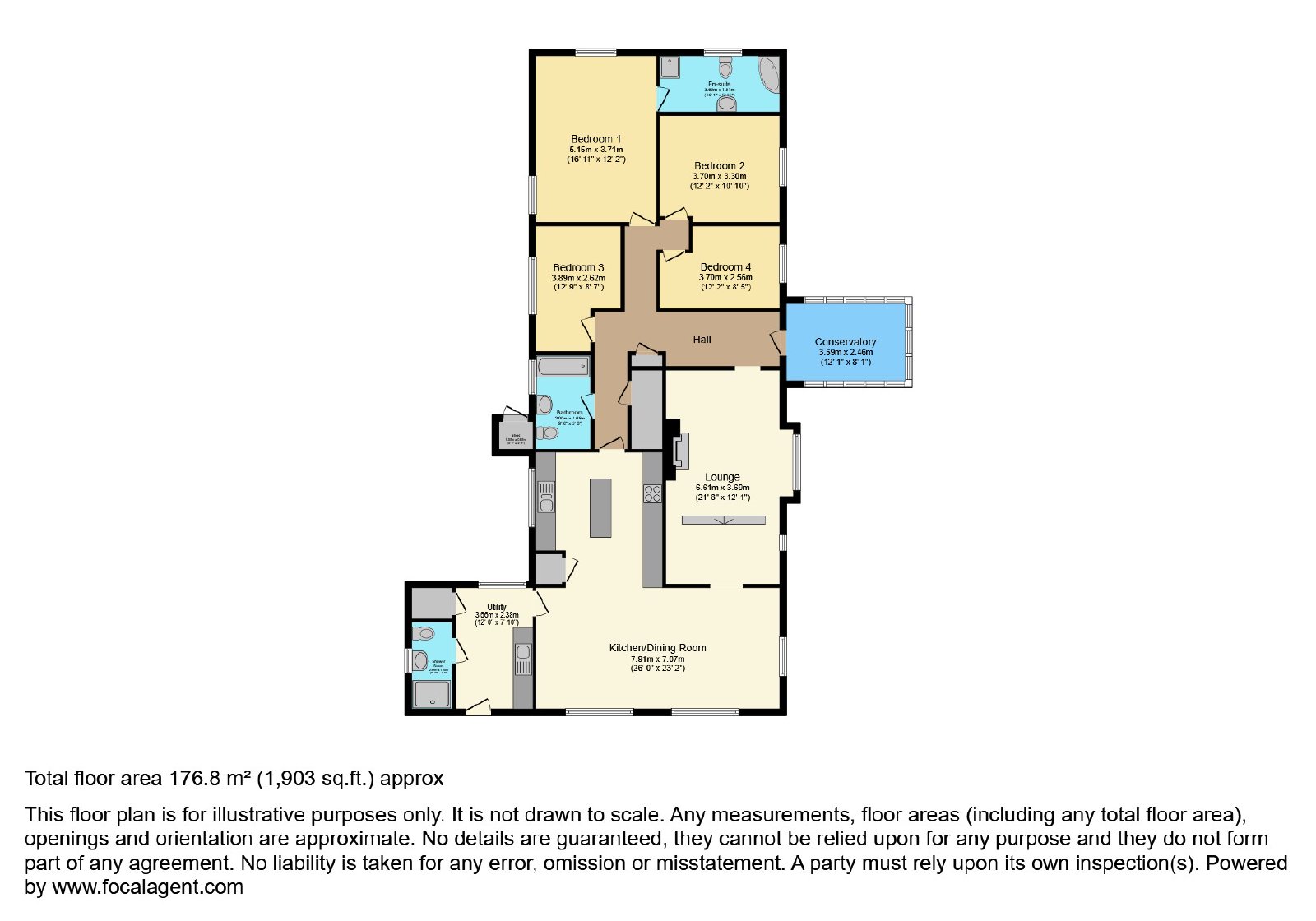 This impressive single-story property offers a spacious and versatile living environment, ideal for families seeking a blend of comfort and functionality. The floor plan boasts a substantial total floor area of approximately 176.8 square meters (1,903 square feet), ensuring ample room for various lifestyle needs. Upon entering, you are greeted by a generous hallway that seamlessly connects the primary living spaces. The expansive lounge area, measuring 6.65 meters by 3.69 meters, provides a welcoming atmosphere with plenty of natural light. Adjacent to the lounge is a large conservatory, perfect for relaxation and enjoying the garden views. The heart of the home is the open-plan kitchen and dining room, which spans 7.91 meters by 7.07 meters. This well-appointed space is designed for both everyday dining and entertaining, featuring modern appliances and ample counter space. The property includes four well-proportioned bedrooms. The master bedroom, measuring 5.15 meters by 3.71 meters, is a private retreat with an en-suite bathroom for added convenience. The other three bedrooms offer flexibility for family members or guests, with two additional bathrooms ensuring comfort for all. A notable feature of this property is the extensive outdoor area, designed for equestrian use. The outbuildings include stables and a large barn, providing excellent facilities for horse enthusiasts. The expansive grounds include a well-maintained riding arena, lush paddocks, and plenty of space for outdoor activities. The plot size offers significant potential for further development or simply enjoying the vast open space and tranquillity. This unique property combines the best of rural living with modern comforts, making it an ideal home for those seeking a peaceful countryside retreat with excellent equestrian facilities.