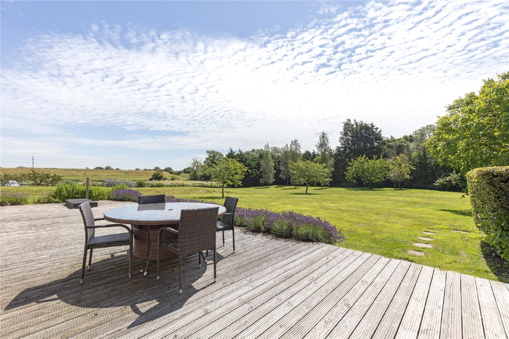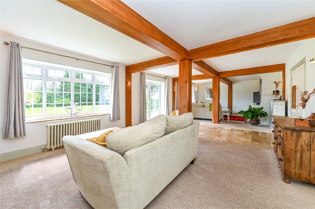 Spanning the rear of the farmhouse, the inviting sitting room invites relaxation and entertainment within its open-plan ambiance. Exposed beams infuse rustic charm, while a captivating log burner serves as the focal point, fostering an inviting atmosphere. Adjoining this space, a tranquil seating area offers picturesque views of the sprawling gardens. While adjoining double doors lead to a snug. French doors open onto a raised decking area, seamlessly connecting indoor and outdoor living spaces.