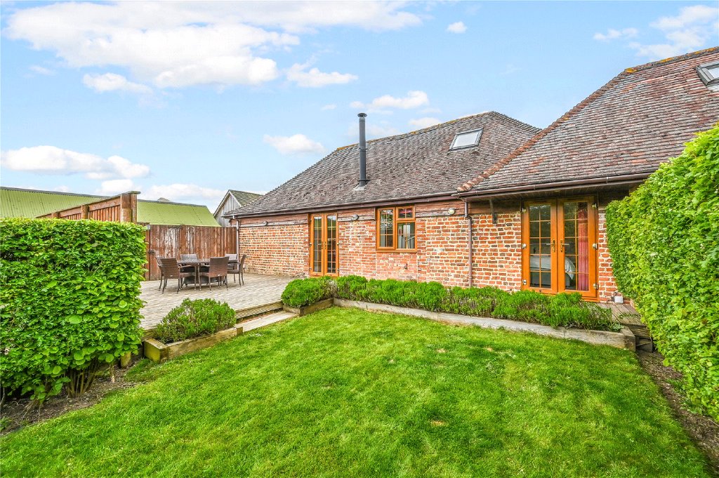 The Barn: Situated at the western end of the farmhouse, The Barn radiates character and charm. Its open-plan vaulted kitchen/living area features a wood-burning stove, exposed beams, and brick walls. Additionally, it offers a mezzanine bedroom or study, a spacious double bedroom with French doors leading to the garden, and a contemporary bathroom. The Barn provides access to a private decking and garden area through the open plan living space.
