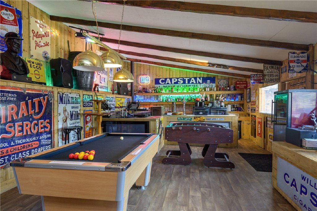 The drive continues past the house to the L-shaped stable block with ample storage opening onto a large concrete yard with a five-bar gate directly into the fields. The far side of the yard has a huge agricultural extended barn which has been converted into a pub and games room with double doors opening into the yard for larger parties. Steps lead up to a further large open barn that is used as a substantial garage space for numerous cars.
