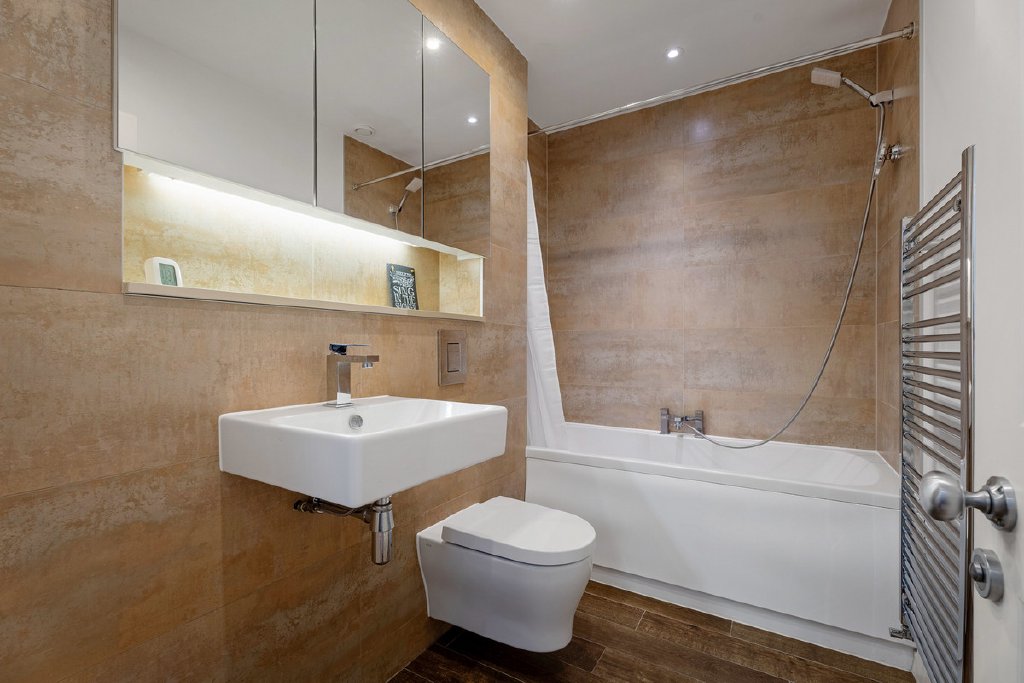 Arriving through the main entrance of the building via a secure gate you arrive in the impressive, landscaped courtyard garden through which you access the apartment via a lift or the stairs. Once inside, the apartment is beautifully presented with a contemporary feel. Upstairs is a light and airy kitchen, living/dining space whilst downstairs there are 2 bedrooms and 2 bathrooms. There is oak flooring throughout and underfloor heating in the main living area as well as in the bathrooms.