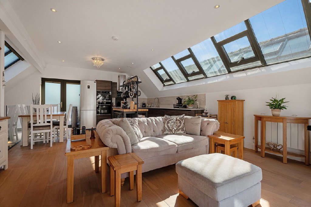 Stairs lead up to a contemporary loft style kitchen, living and dining space with skylights above and an engineered oak floor. The kitchen has beautiful Sile stone worktops and features integrated Caple appliances including combi and microwave ovens and a ceramic hob as well as a Neff dishwasher. The open plan kitchen is perfect for cooking and entertaining and leads through to the lounge area. Original windows to one end face West and offer superb views of the surrounding area and evening sunsets. The apartment is only one of three in the building which have a private balcony and double doors lead out onto an East facing balcony with space for a table and chairs overlooking the courtyard garden, the perfect place for a morning coffee.