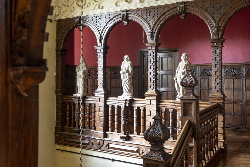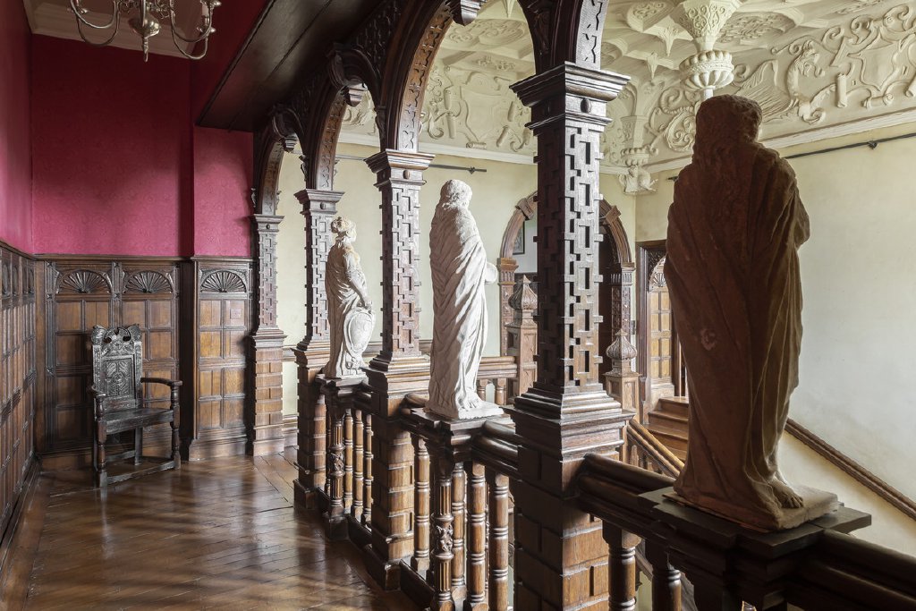 The home underwent a sensitive restoration in the 1980s, carefully reviving its many period details. From the moment you step inside, you are greeted by an array of exceptional architectural features: intricate plasterwork, stone mullioned windows, stately fireplaces, the remarkable Jacobean staircase, and decorative friezes. The magnificent Great Hall is a centrepiece of the property, showcasing its impressive Corinthian fireplace and the Gibbs family coat of arms.