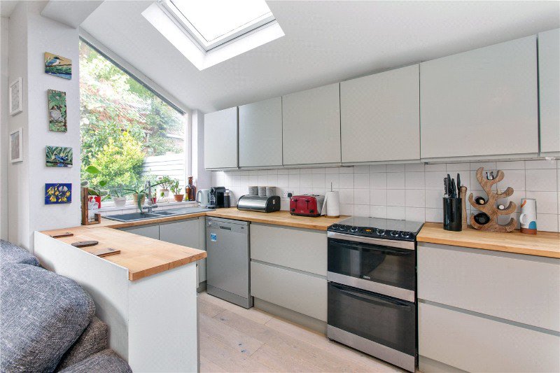 Upon entering, you are greeted by a spacious, extended open-plan reception and kitchen area, illuminated by large skylights and patio doors that lead to the private rear garden. The modern kitchen features sleek cabinetry, ample worktop space, and is well-equipped for entertaining. The garden offers a peaceful retreat, ideal for al fresco dining or enjoying morning coffee.