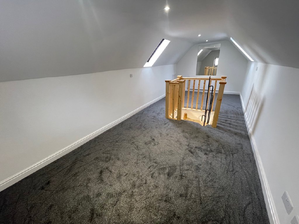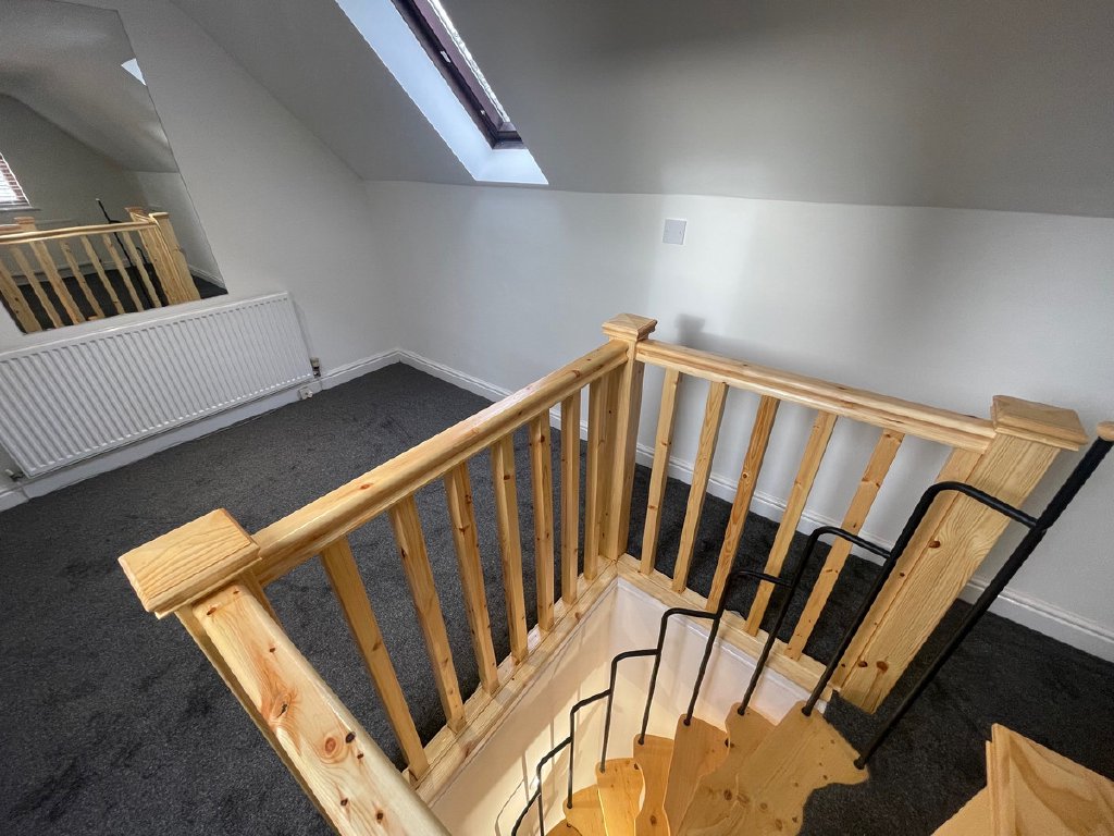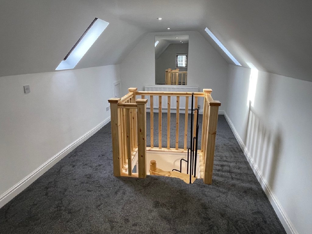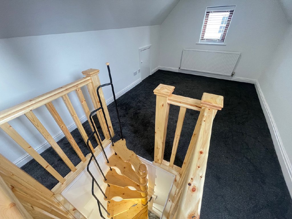 The second floor with new wooden spiral staircase offers a versatile, large, converted attic room with Velux windows, ideal for use as an office, spare bedroom, or creative studio space.