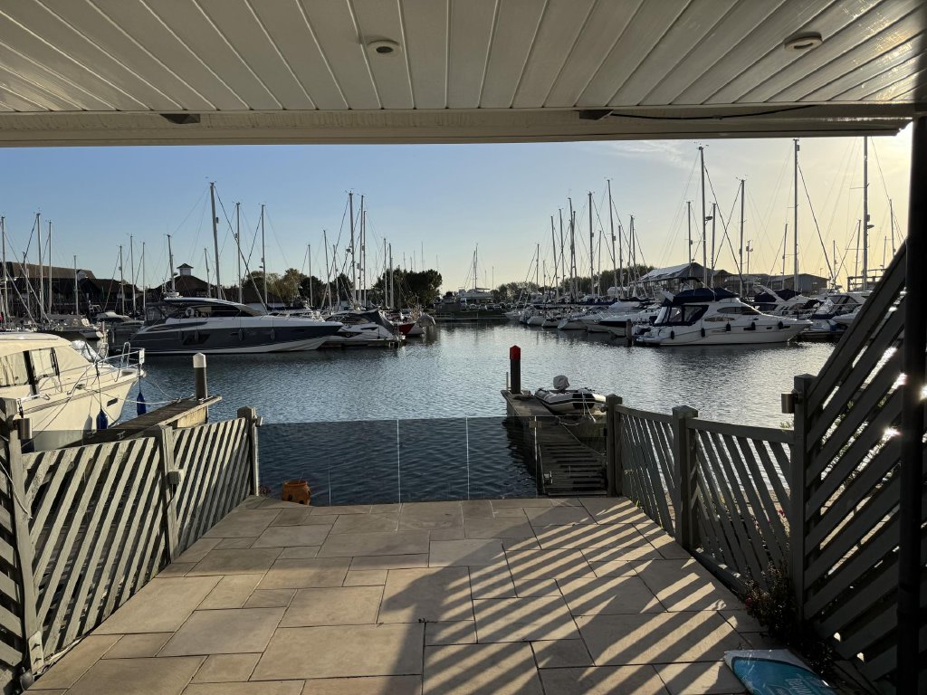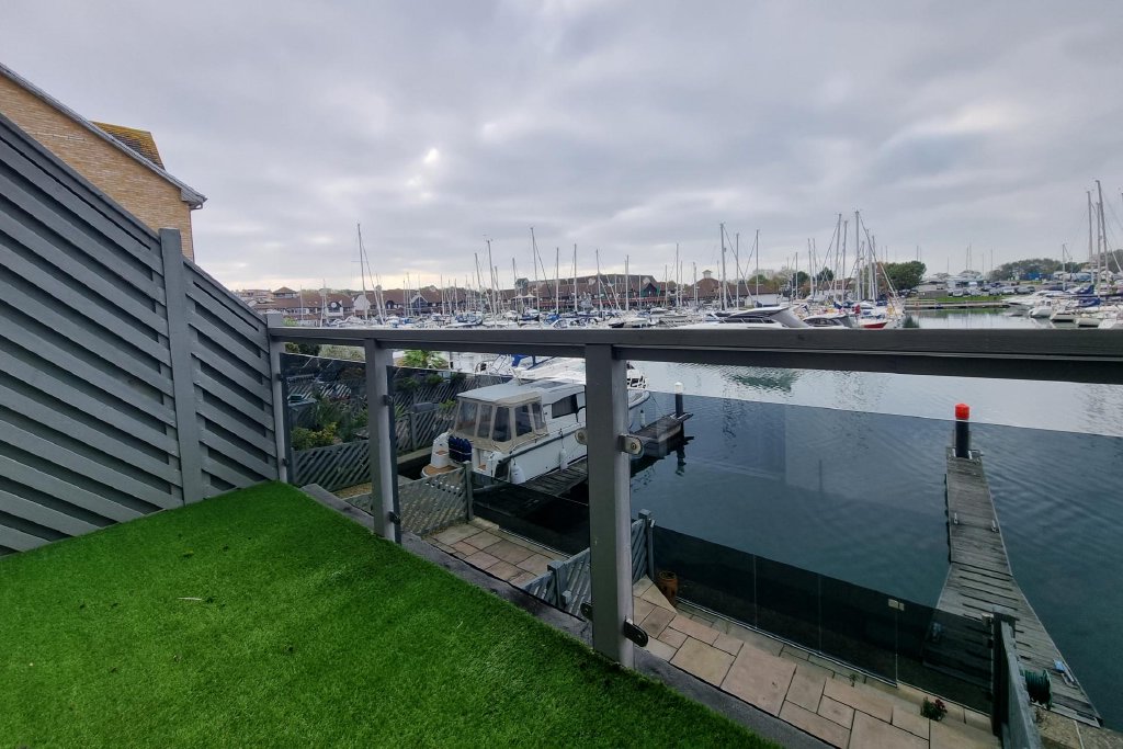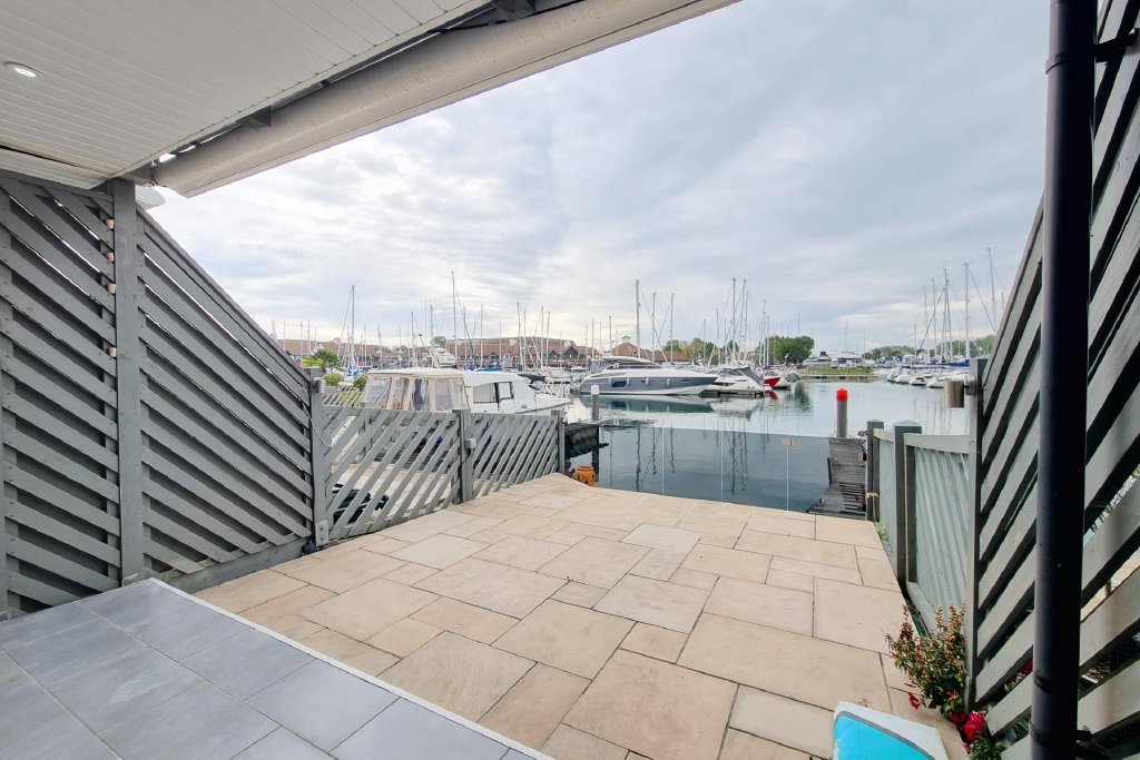 OUTSIDE To the rear on the top floor is a Jesters balcony with twin doors from the main bedroom, on the first floor is a balcony from the lounge with glazed screens, wooden balustrade and false grass. On the ground floor are bi-folding doors from the dining area leading to a terrace with matching tiled flooring, stepping down to flagstone patio with floating glazed screens to one end and gateway leading to berth, external lighting and power, , covered area with remote control awning, cold water tap.
