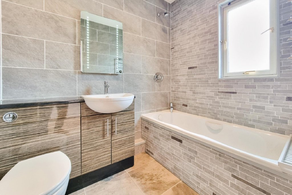 EN-SUITE BATHROOM White suite comprising: panelled bath with corner mixer tap and separate shower over with wall mounted controls, ceramic tiled to floor and walls, double glazed frosted window to front aspect, wash hand basin with mixer tap and cupboards under, concealed cistern w.c., wall mounted automated mirror with lighting, chrome heated towel rail, tiled flooring, controls for ceiling heating.