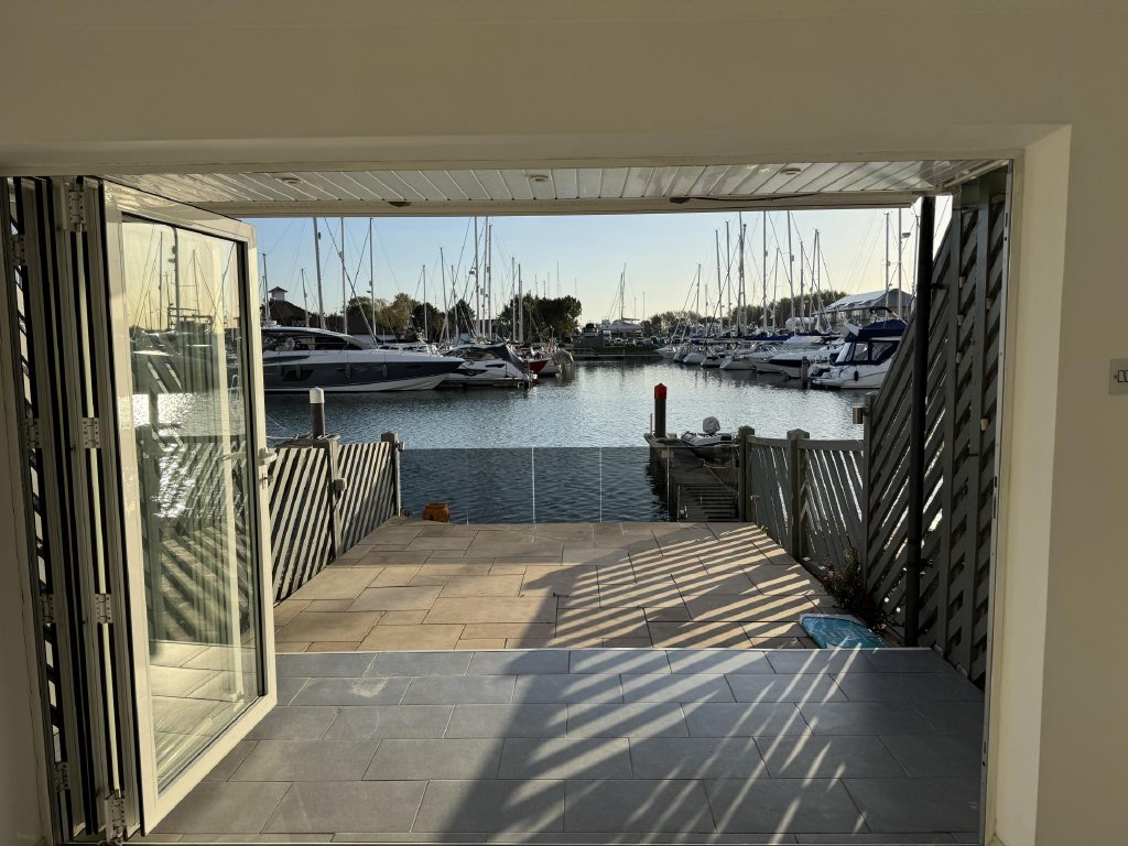 Dining area: Tiled flooring, ceiling spotlights, ceiling speakers, bi-folding doors to terraced garden and berth with views over the moorings and marina.