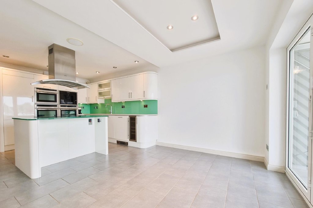 KITCHEN/DINING ROOM 20' 0" x 12' 1" (6.1m x 3.68m) Kitchen area: Comprehensive range of white fronted wall and floor units with soft close mechanism, granite work surface, inset 1½ bowl sink unit with granite drainer to one side, mixer tap, waste disposal unit and cupboard under, integrated Neff dishwasher with matching door, bin drawer, wine cooler, curved corner unit, glass splashback, chrome fronted power points, ceiling spotlights and coving, two Neff ovens, microwave and coffee maker with storage cupboards over and under, integrated fridge and freezer with matching doors, kick plate heating and spotlights, tiled flooring, smoke alarms, controls for ceiling heating. Central island with glass top, four ring Neff induction hob with stainless steel canopy extractor hood, fan and light over, drawers to one side and breakfast bar to the other.