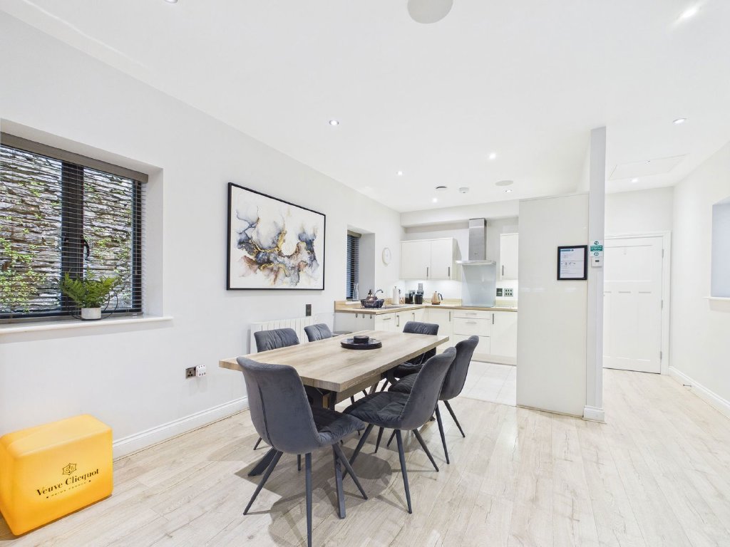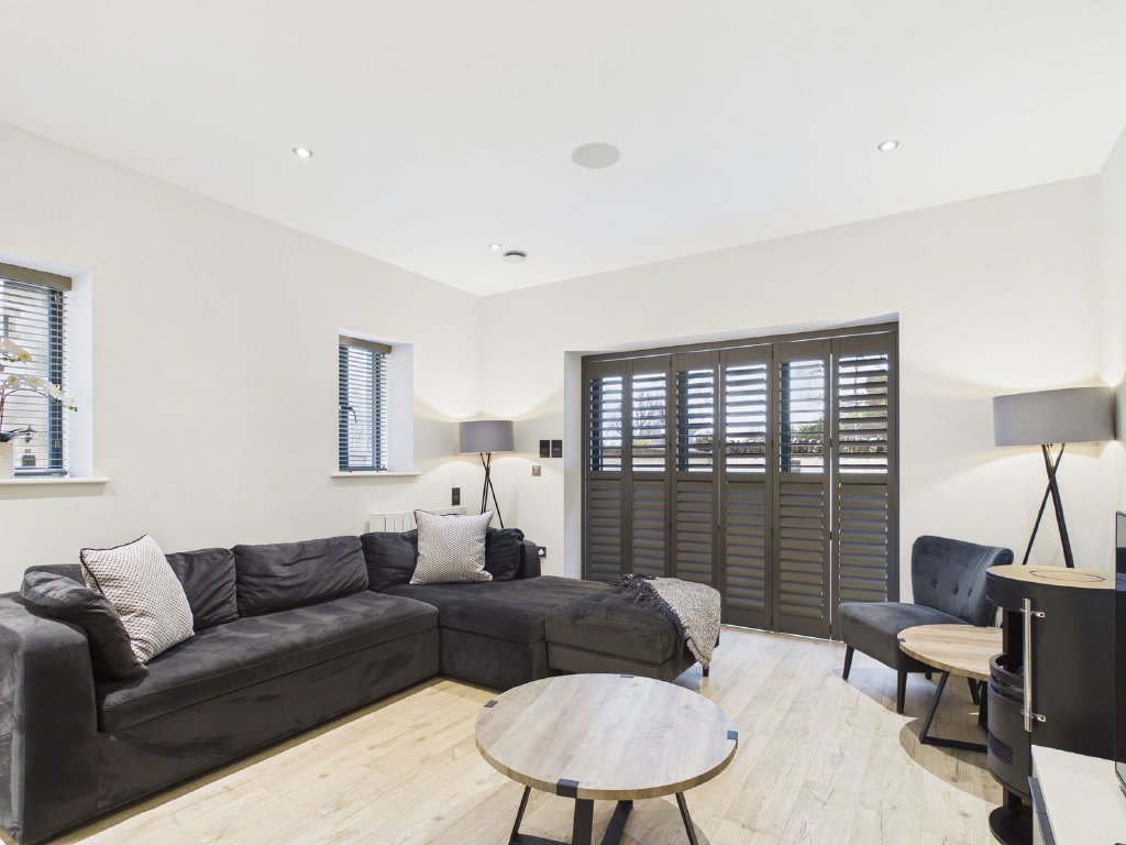 The main open plan living space is lovely and light being triple aspect. Lamps are on a lighting circuit for convenience and atmosphere and there are shutter clad bi-folding doors at the far end, opening to the courtyard. The space is generous and offers room for comfy seating around the decorative heating stove and Smart TV, a roomy dining area and a contemporary and well-equipped fitted kitchen. There is an inbuilt sound system (DAB, Bluetooth and FM) with ceiling speakers in the living area and main bedroom.