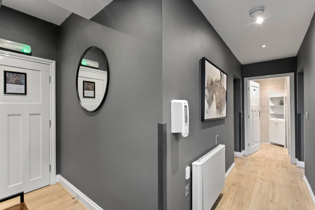 Open the solid oak front door and step into the entrance hall, laid with hardwearing Karndean flooring which extends through into the open plan living kitchen. The internal paneled doors are painted a crisp fresh white and have heritage style handles, whilst all date from the conversion, they are designed to reflect the period of the house. In the entrance hall is an intercom connecting New Lodge to the main building. A deep walk-in store offers great space for your coats and boots and acts as a housekeeping cupboard for letting essentials.