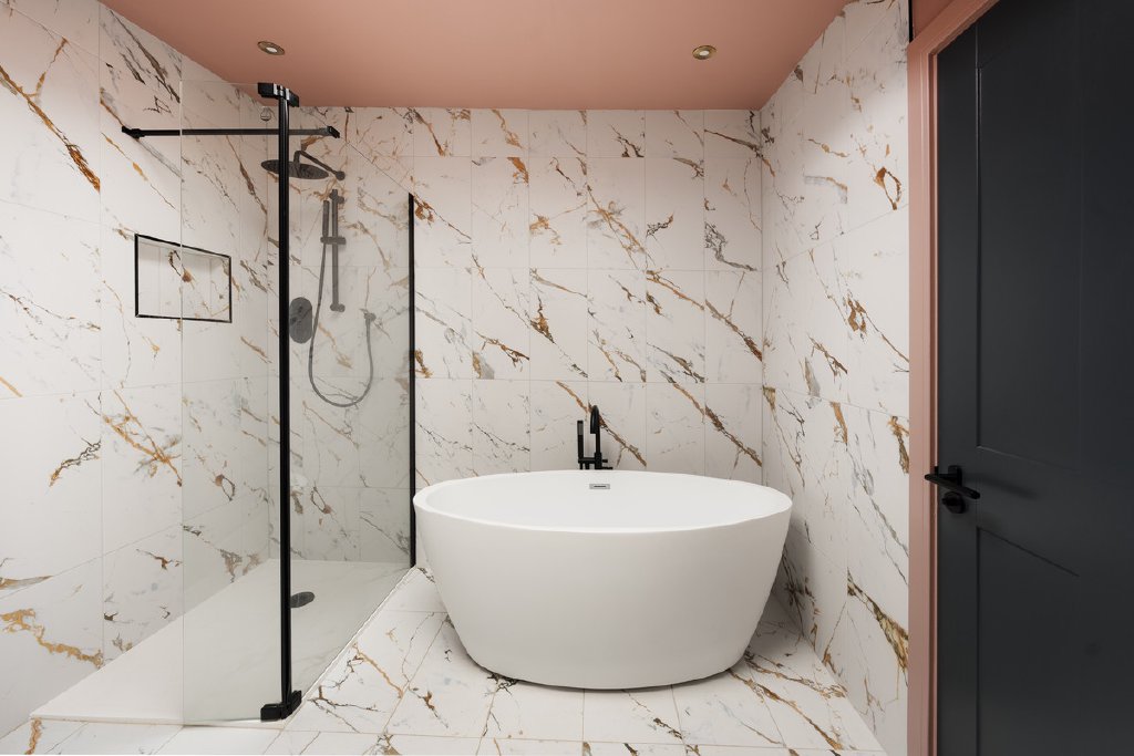 A striking staircase connects the levels. The lower ground floor offers a utility room and a generous bedroom suite with fitted wardrobes, modern shower room and French doors opening onto a private patio terrace. The upper floor comprises two further double bedrooms, one enjoying coastal and garden views, served by a beautifully appointed Jack & Jill bathroom with freestanding roll-top bath, separate shower and double basins.