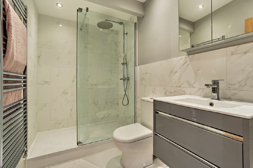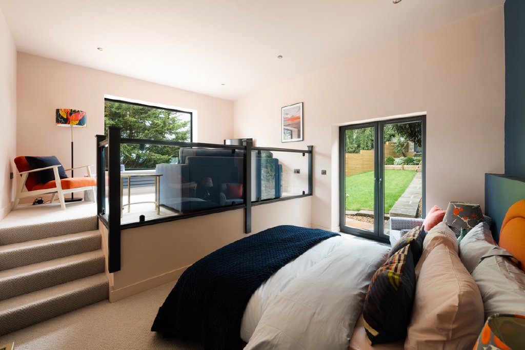 A fourth bedroom sits within a more private part of the house, featuring high ceilings, garden access and a raised sitting area, supported by a contemporary shower room off the main hall, ideal for guests or an independent relative.