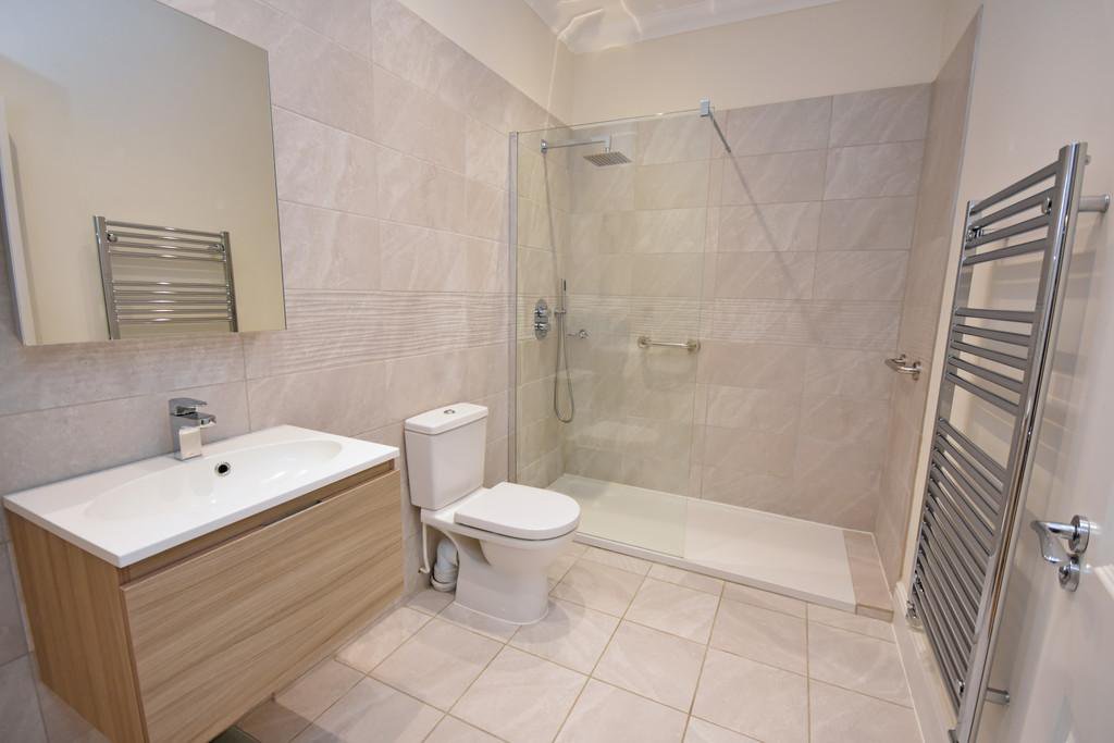 The principal bedroom suite is a generous, stylish retreat with built-in wardrobes and a luxurious en suite bathroom featuring a bath, separate rainfall shower, and contemporary fittings. The second bedroom, also spacious with high ceilings, is served by a beautifully appointed shower room.