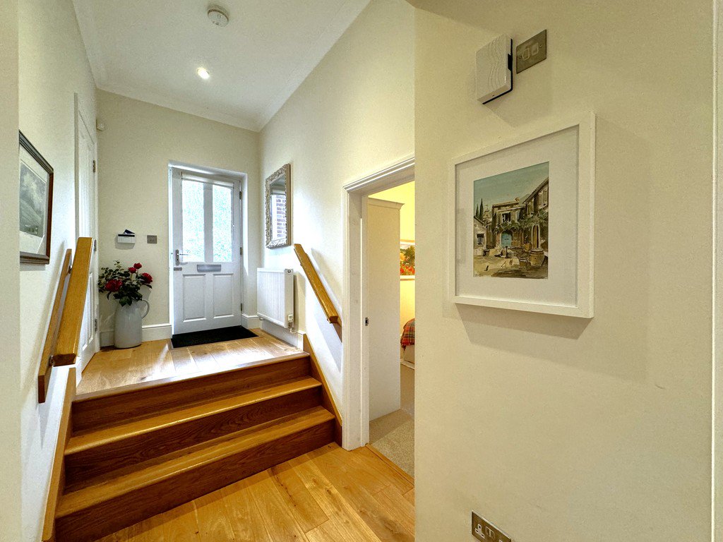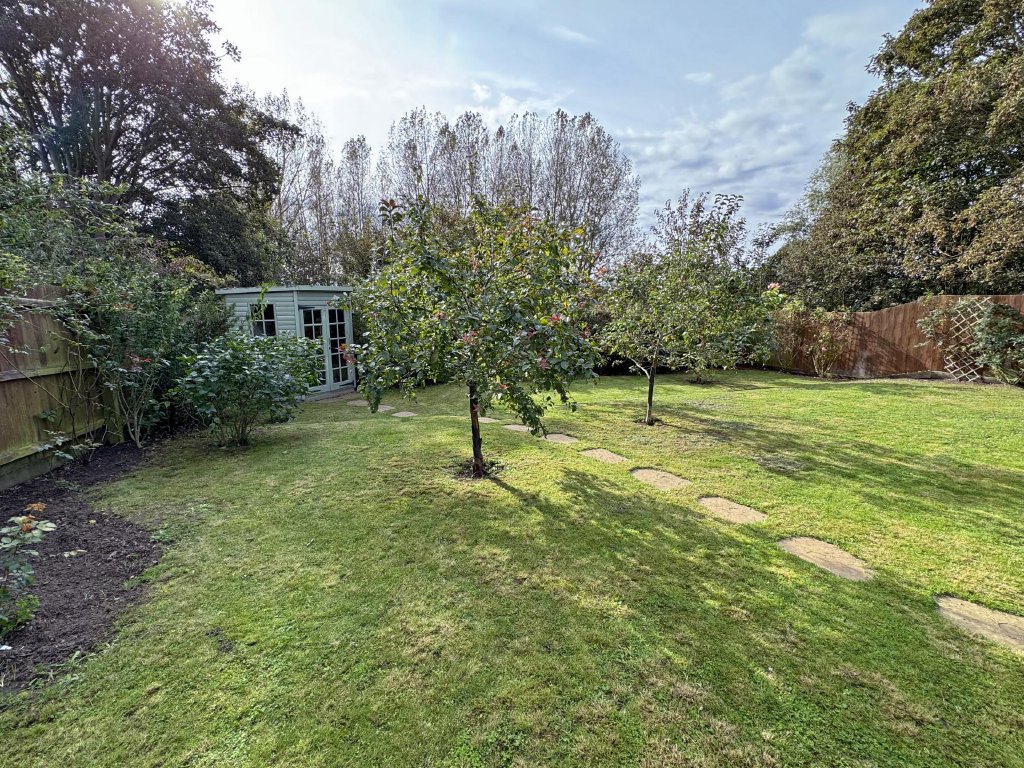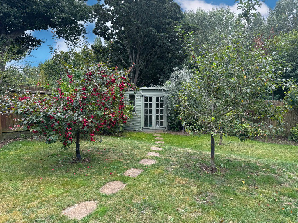 The private, south-westerly facing garden provides a haven of peace and privacy, bordered by mature shrubs and interspersed with fruit trees. A paved terrace offers space for outdoor dining, while a summerhouse sits gracefully at the end of the garden. The property also benefits from dedicated parking immediately outside, with additional visitor parking nearby. Residents also enjoy use of the beautifully maintained communal gardens within the development.