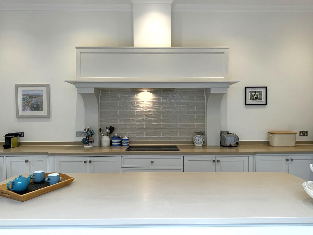 Double doors lead through to a showstopping kitchen and dining room - a true highlight of the home. Finished in classic Shaker-style cabinetry with premium Neff and AEG integrated appliances, this space has been designed for both everyday living and entertaining. A large central island forms the heart of the room, while the glazed lantern ceiling and wide patio doors flood the area with natural light. The space opens directly onto a sunlit terrace, ideal for alfresco dining and gatherings with family or friends.