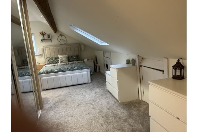 Superb Semi Detached Chalet Bungalow consisting of: Hallway. Laminate flooring. Coat cupboard. Kitchen/Lounge. 6 x 4.3 metres, Wren grey wood fitted kitchen, comprising of integrated dishwasher, fridge/freezer, washing machine, microwave and oven all to remain. Boiler is housed in kitchen unit. White quartz worktop. Wall mounted tv. Wall mounted electric fire. Laminate flooring. Electric points/usb points. 5 metre patio doors open to rear south east facing flat large garden. Front Lounge/Bedroom 4. 4.3 x 3.3 metres with bay window. Electric points. Laminate flooring. Fitted laminate vertical blinds to remain . Wood door. Bedroom 3. 2.7 x 3.2 metres. Fitted laminate blinds to remain. Carpet to floor. Electric points. Wood door. Bathroom. 2 x 1.8 metres. Grey fitted toilet and sink basin unit with chrome mixer taps. White Bath with overhead electric shower, chrome mixer taps. Laminate flooring . Wood door. Stairs leading to: Loft room/bedroom 2. 3.3 x 2.7 metres. Carpet to flooring. Electric points Wood door. Velux tilt ans turn window. Access door to attic access. Loft room 1/bedroom 1. 6 x 4 metres, carpet to floor, Velux tilt and turn window plus further side window. Fitted glass wardrobe. Attic access electric points/usb points. Wood door. Access to: En-suite , 3 x 2.3 metres. Laminate floor. Fitted sink unit in grey. Chrome mixer taps. Large walk in shower unit with chrome combination boiler shower. Black shelving to alcove. Attic access. Velux tilt and turn window. Outside is off road parking and front and rear gardens. Viewing highly recommended ◦