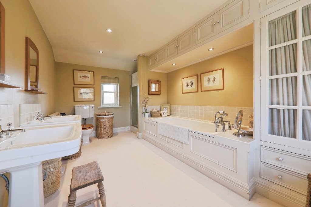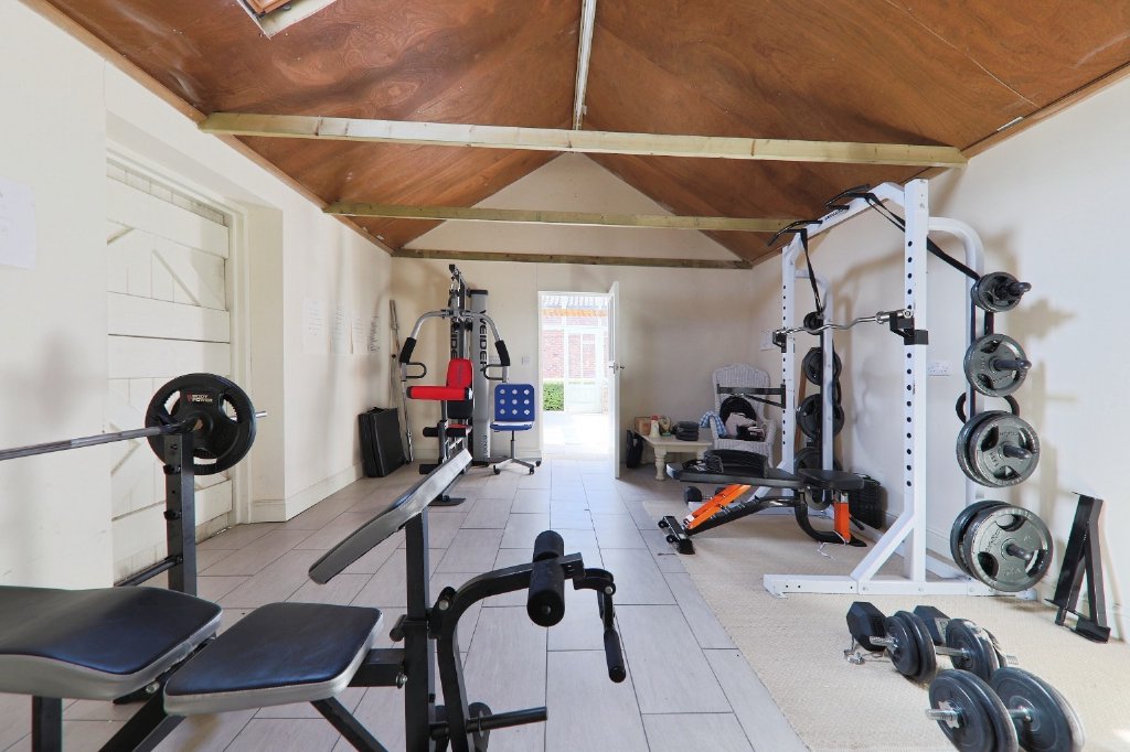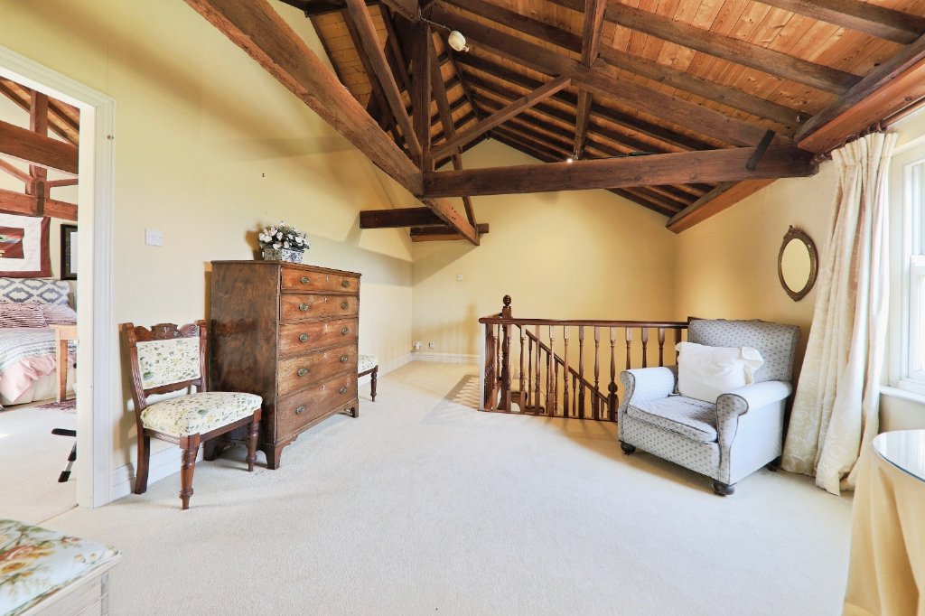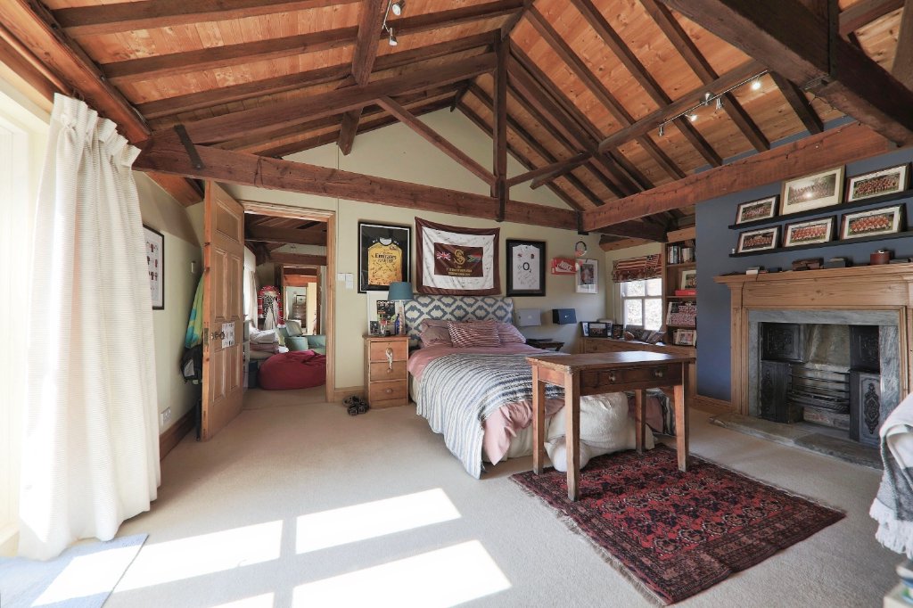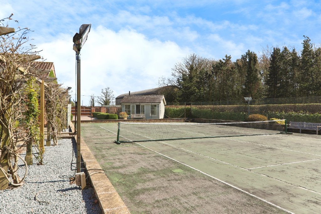There’s a full-size floodlit tennis court, a separate gym, and a store. At the back, there’s a large paddock which would suit those with equestrian interests, and a 3,000 sq. ft. Dutch barn with high eaves.