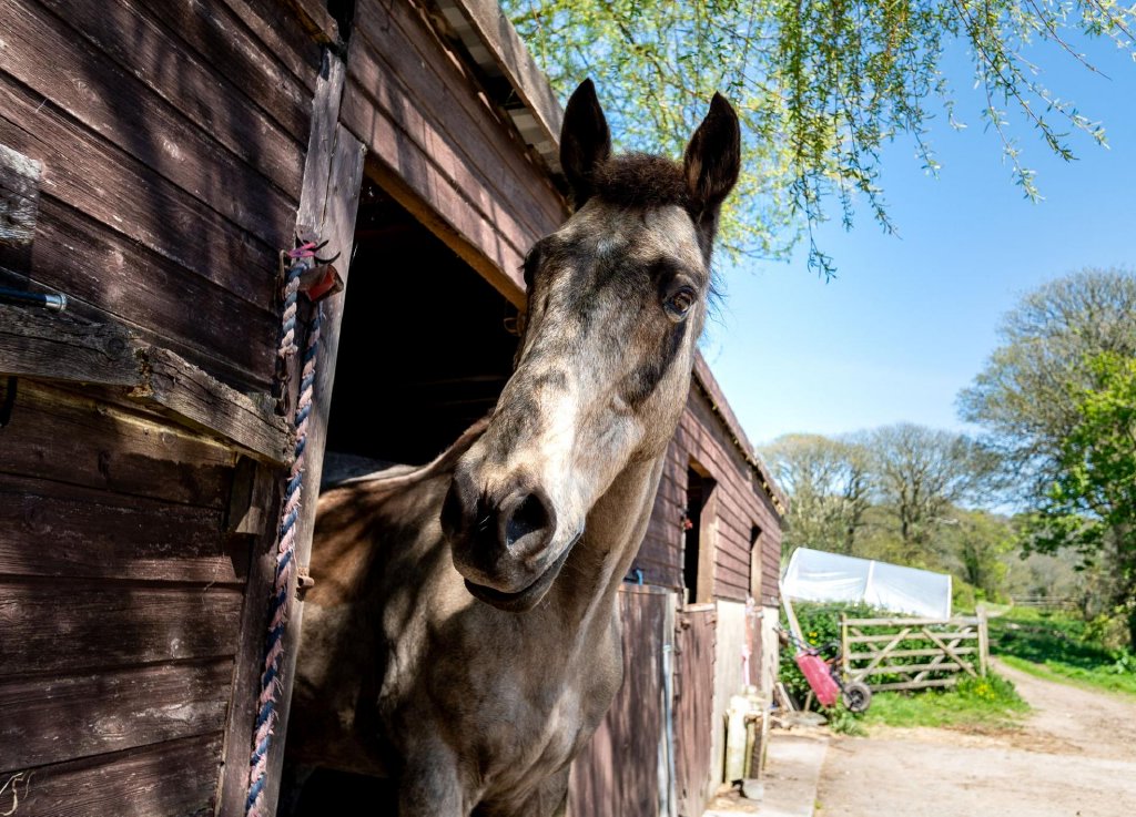 Across the quiet country lane lies a well-equipped stable yard and pasture paddocks, ideal for horse owners or those interested in hobby farming.