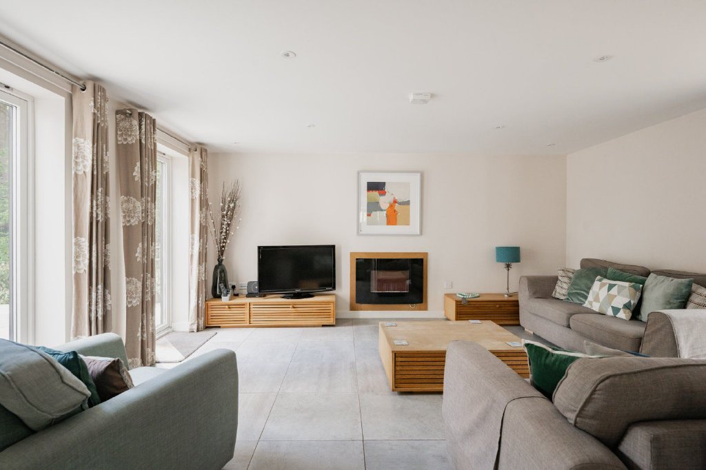 Outside, the property enjoys a wraparound terrace with steps down to a spacious lawn to the front, leading around the side of the property and to the rear. A long driveway leads to an outbuilding which is currently used as a workshop and storeroom. The grounds extend to 0.84 acres and are incredibly private with open fields to the rear and woodland on either side.