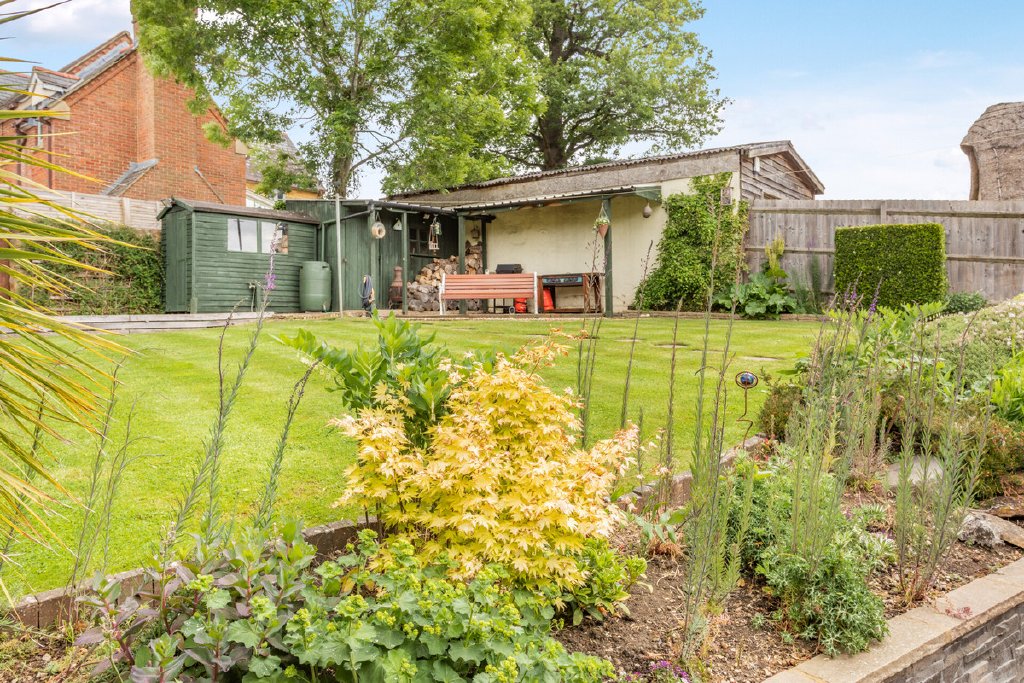 - Beautifully landscaped gardens with a large paved patio, sweeping lawns, mature trees, and a covered seating area